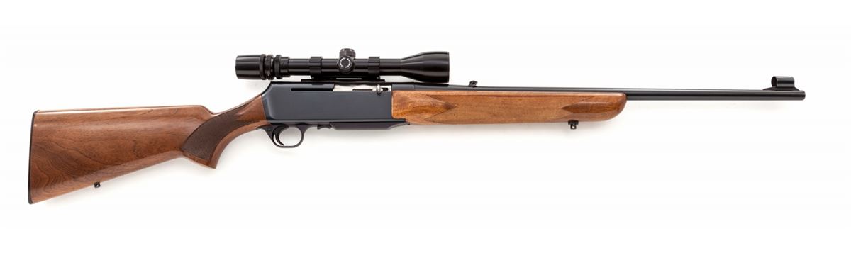 Early Belgian Browning BAR Semi-Automatic Rifle, #3689M7, .30-06 cal., 22'' barrel, blue finish, checkered walnut stock, with Bushnell Scope Chief IV 3-9x scope on tip-off Pachmayr mount. Mfg'd 1967, first year of production. Condition is excellent showing only light marks from handling. Metal surfaces retain approx. 97% blue with very light thinning at high edges. Stock with light impressions from handling. Good action, bright bore, good scope optics. Est.: $500-$750. (Modern)