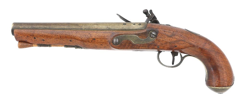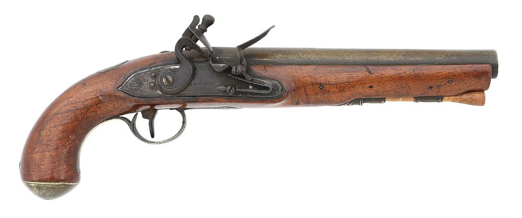 69 cal, 8 3/4'' round barrel with a moderately oxidized bore. The brass barrel and fittings have taken on an attractive deep tarnish toning to a dark grayish ocher patina showing some scattered mild dings and handling marks, the strap of the triggerguard being a lighter goldenrod. There are light embellishments at the breech along with Birmingham proofs and ''LONDON'' atop. The lockplate is of expected spartan construction with unbridled frizzen and has toned to a deep plum-brown patina showing a bit of old oxidation. The frizzen is a more modern aged replacement and the cock screw is an old brass screw. The lockplate shows a light foliate motif at the rear and simple line border, the center retaining strong maker markings with ''T. / KETLAND / & Co''. Brass fittings consist of a single ramrod thimble with tailpipe, triggerguard with simple foliate finial, buttcap, flat sideplate and monogram plate atop the wrist. The smooth walnut stock remains in very fine condition showing a little older added finish and otherwise maintains a nice honest appearance with just some scattered light dings and handling marks. Hardware fit remains very nice overall and a simple ramrod is present. The lock holds properly at half cock but does not hold at full. This is a very handsome example of a large bore early Ketland made circa the mid-1790s and were popular imports in Canada and the US for use by militia and as trade goods. (13B11133-3) {ANTIQUE} (800/1200)