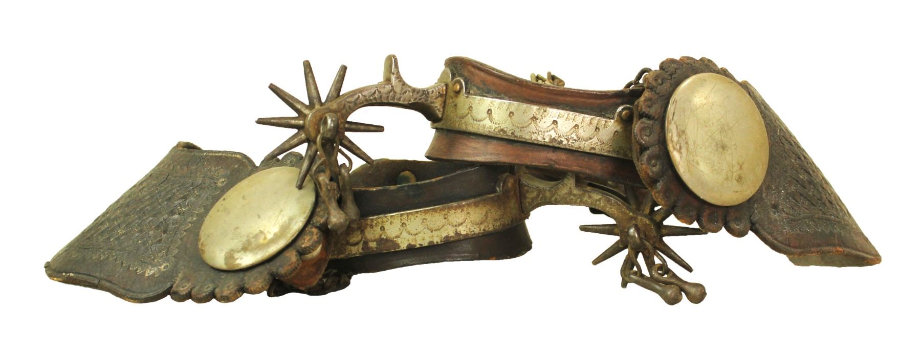 Extremely uncommon pair of early Buerman drop-shank spurs with rare leather liners and terrific flower tooled straps. With very nice condition and eye appeal.