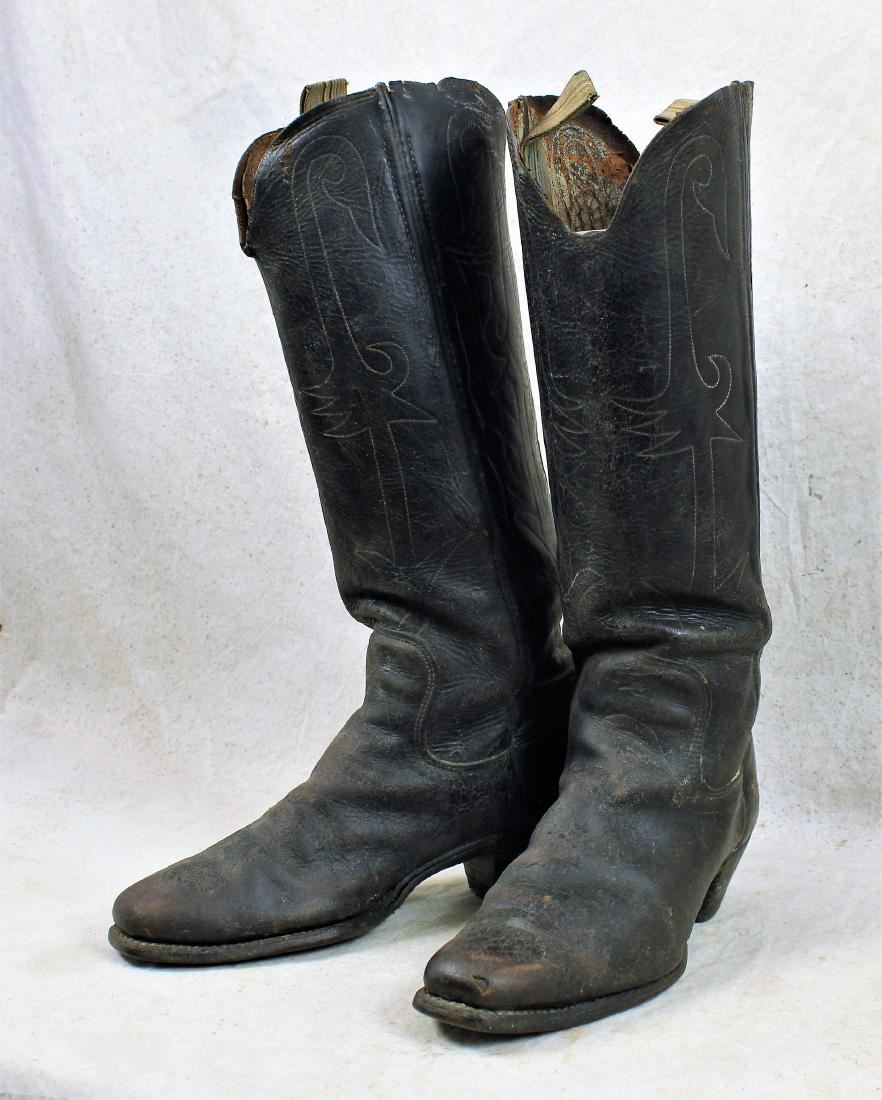 Interesting early square toed boots with tall stitched uppers, riding heels and cloth pulls.