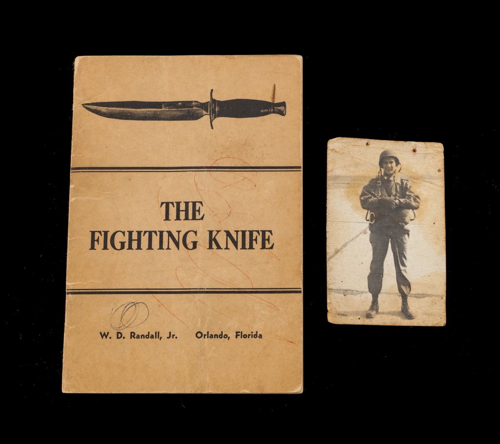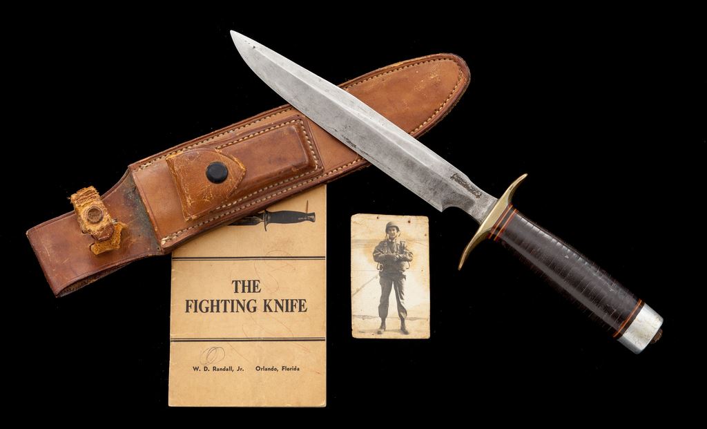 Early Randall Knife Number 1 Fighter, with booklet and photo, with 8'' blade, marked at ricasso ''Randall Made, Orlando, FLA''. Stacked leather washer handle with five alternating thick and thin spacers at the hilt and three thick and thin spacers at the pommel. Thick aluminum pommel with brass nut and washer, with no thong hole or loop. Brass crossguard with double ends. Blade measures 7.75'' in length and has the typical deep choil at the base and is very sharp. Sheath is original to the knife and made by Heiser, marked on back with the oval Heiser trademark stamp, a ''1'' above, and an ''8'' below the oval stamp. Back of sheath is ribbed as on early Heiser sheaths up to the very early 1950's. Sharpening stone is a grooved, dark reddish brown color and is unmarked. Randall booklet is the sixth printing, dated 1952. Photo shows a U.S. Paratrooper in uniform with parachute harness and his helmet; name and soldier's serial number are on the back. Condition is very good with blade showing light age graying, sharpening, and scratches from use. Stone pouch snap is blackened brass. Retaining strap is missing the snap cover and shows much age and cracking. Sheath has a couple of small cuts one on the front, and one on the back near the tip. Knife probably dates from 1946 to 1952, as it has all the correct characteristics for a post-WWII to Korean War Randall Number 1. Est.: $800-$1,400.