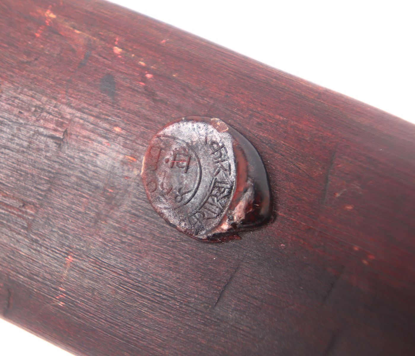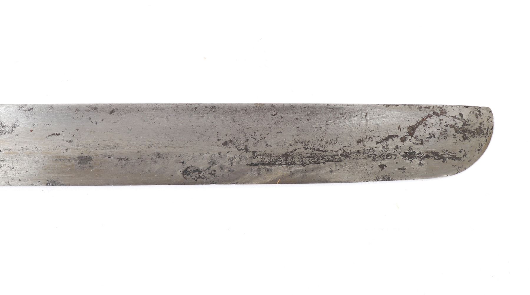 Tibetan Plateau, early Tibet long sword 19th century in traditional form with scabbard in red with painted black foux mounts, strung to the top as a belt loop. The sword with a wide straight single edged blade that curves upward at the tip and features a lightly raised ridge. The handle in brass to the base and pommel with a single band of foux wound spring decoration and the grip in wood with a stippled pattern in bands. Size 33 1/4" L, blade 25 5/8"