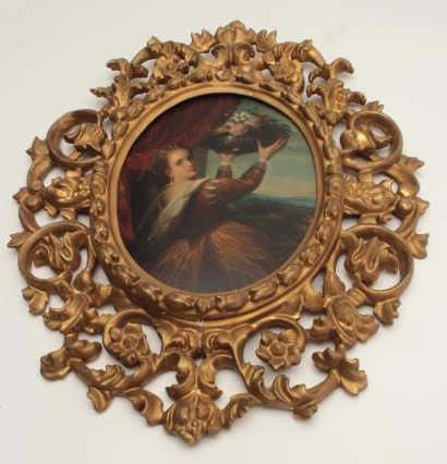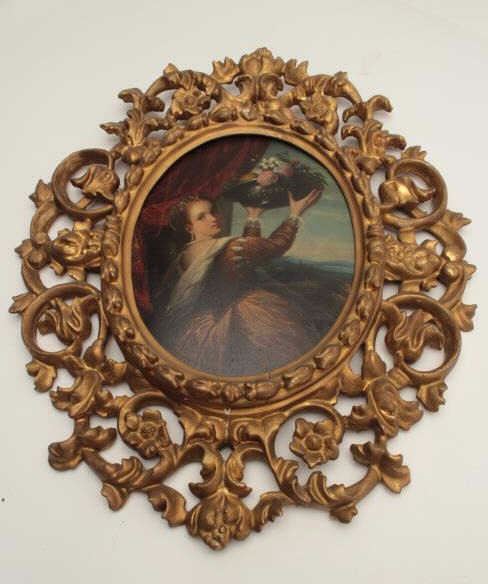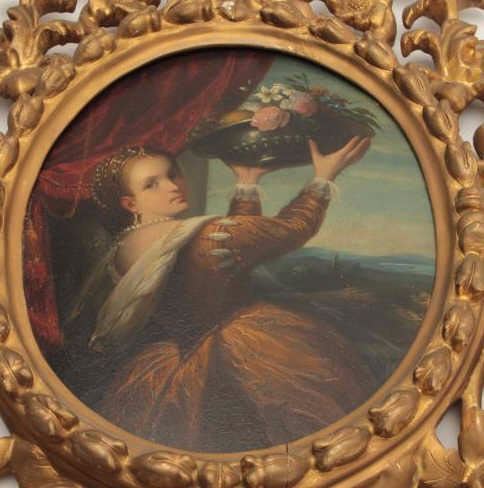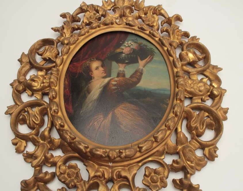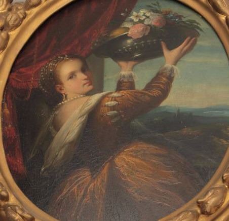 Early to mid-18th century oil painting on board of lady holding basket of flowers in vintage frame. Unsigned. Measures approximately 10 ½” x 8 ¼” image only. Fine quality. Est.; $1000-$2000