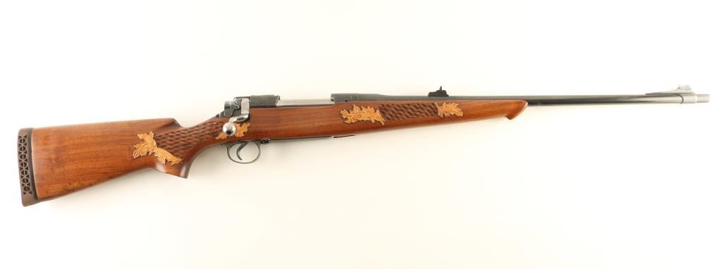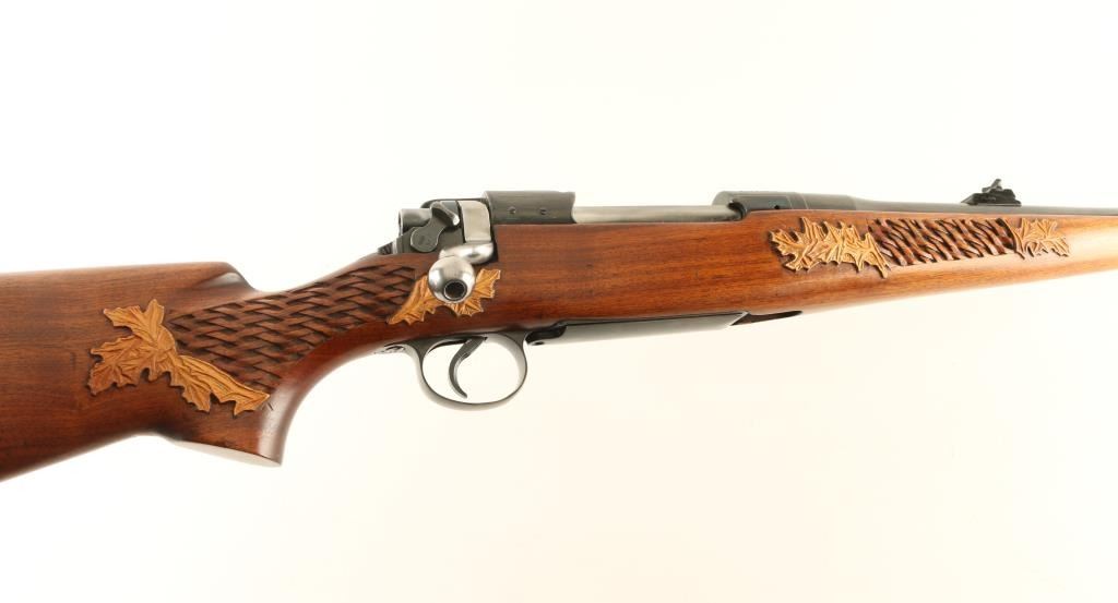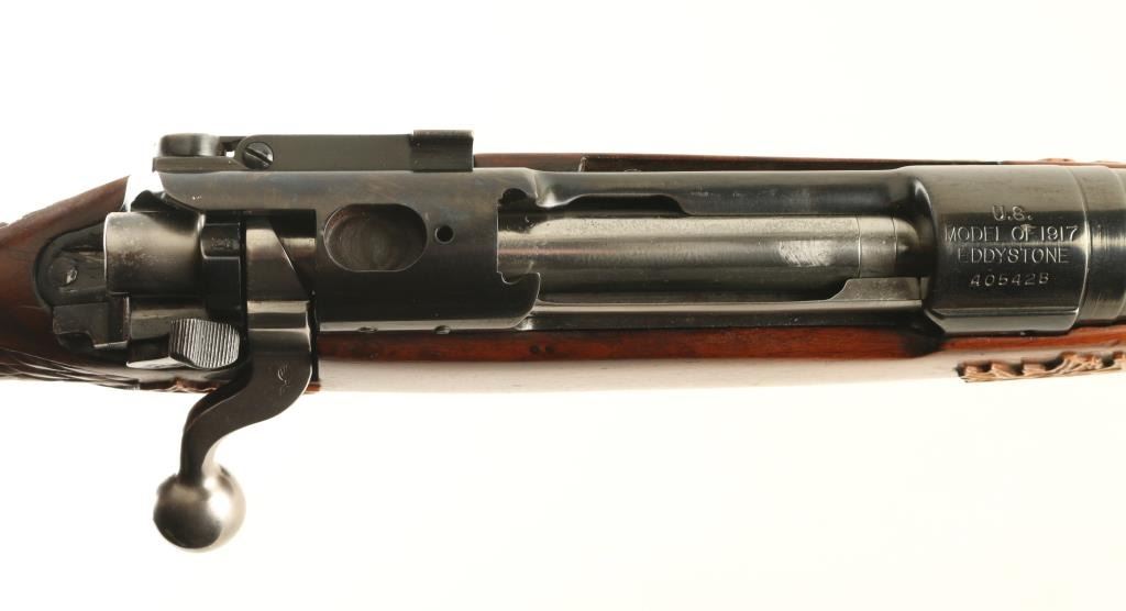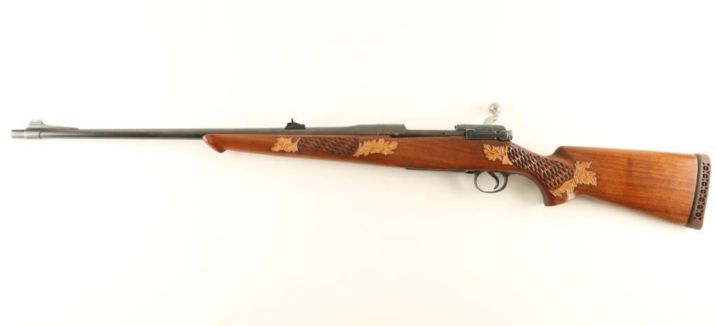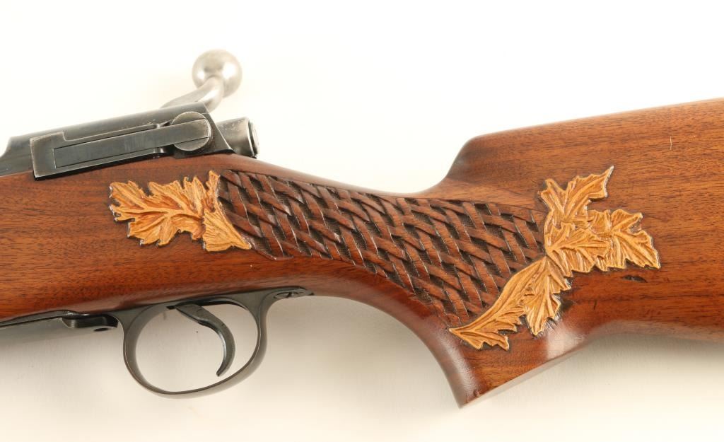Rifle. Bolt-Action. U.S. issued rifle that has been sporterized. Barrel shortened to 24" Military sights have been removed and replaced with adjustable notch rear, and blade front sights. Bore appears good. Action is crisp/tight. Rifle has been re-stocked with a Walnut pistol grip stock. Basket weave, with leaf design are on the forearm, and pistol grip. Pachmyer recoil pad. Blued finish is about 90%. NRA Condition-Very Good. C&R Firearm.