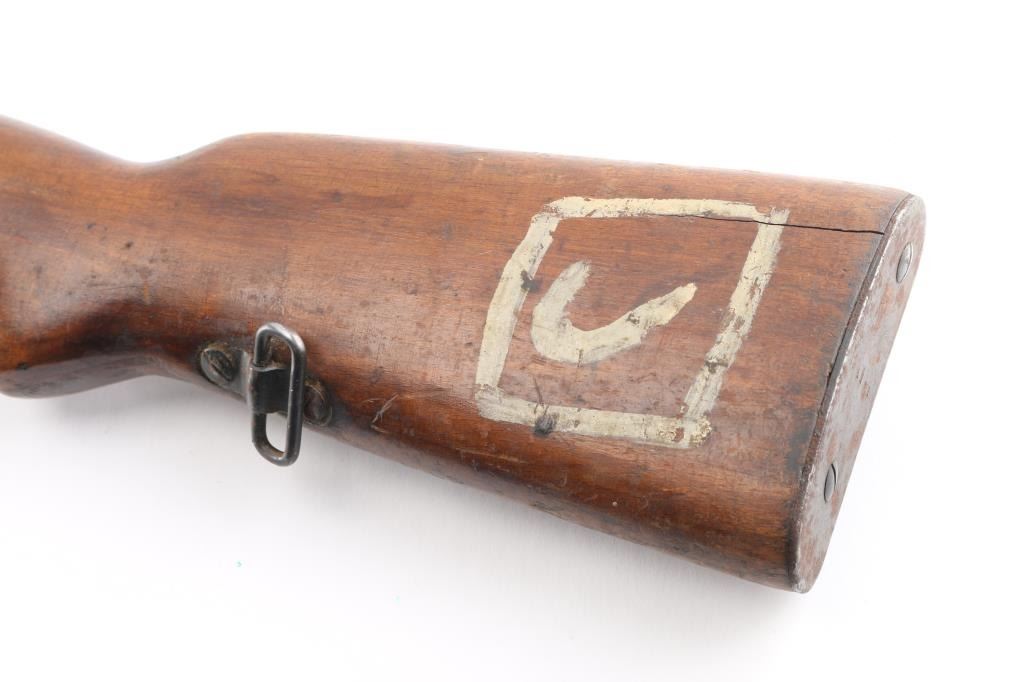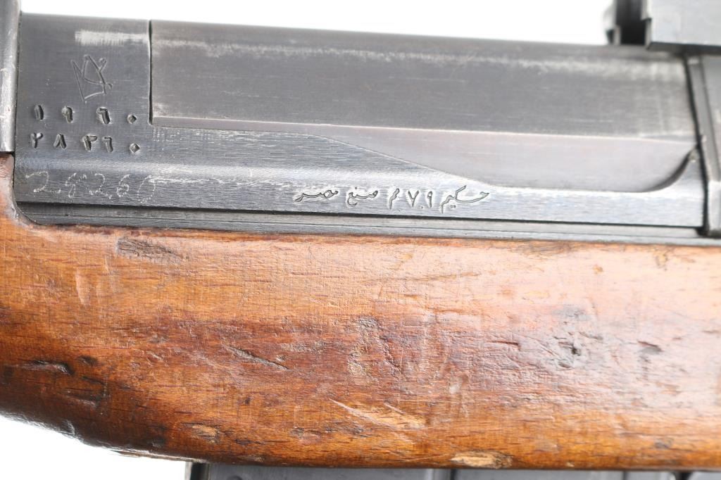 Egyptian military gas operated semi-automatic service rifle chambered in 7.92x57mm Mauser, manufactured by Maadi circa 1950s. Imported by C.A.I. St. Albans, VT. with import marks on the barrel. Features a blued finish, 24" barrel with integral compensator, hooded post front sight, tangent rear sight, bayonet lug, adjustable gas valve, detachable 10 round magazine, smooth trigger, manual safety, sling swivels, smooth wood handguard and a semi-pistol grip shoulder stock with smooth metal buttplate. Rifle exhibits approximately 80% of its blued finish showing scattered handling/edge wear, scratches. Action is strong, bore is dark/rough, rifling present and the wood stocks are overall good/sound with many dings/dents. Arabic symbols painted in white on the buttstock. Produced 1950s-1960s.Condition is NRA Fair to Good. C&R Firearm.