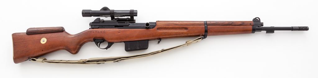 Egyptian Contract SA FN-49 Semi-Automatic Sniper Rifle, #34781, 8mm, 24'' barrel, black finish, European walnut stock with added cheekpiece, brass buttplate with trap, and correct khaki canvas sling. Topped with a Me-Opta 2.5-power scope with German three-post reticle on Echo mount. Right side frame marked ''Fabrique Nationale de'Armes de Guerre Herstal Belgique'' with serial numbers both in English and Arabic. Egyptian crown to top of receiver ring. Islamic characters to brass stock disc and top of scope. All major components with matching numbers. Condition is excellent. Rifle exhibits little use with only pressure dings to stock from handling. Action is crisp, scope optics are excellent, bore is mirror bright. Est.: $2,500-$3,500. (C&R) (Joe Poyer collection)