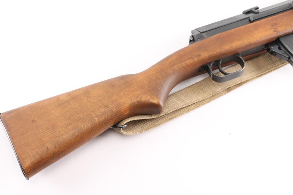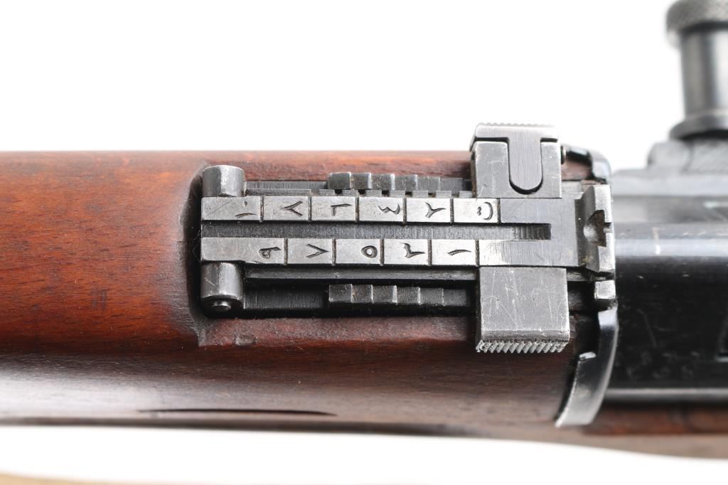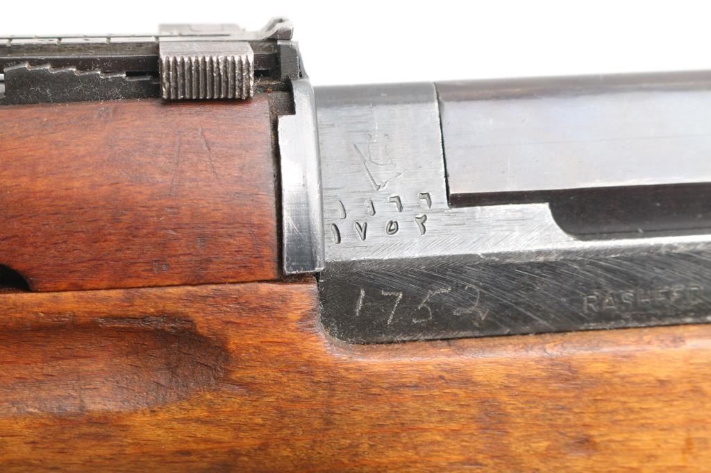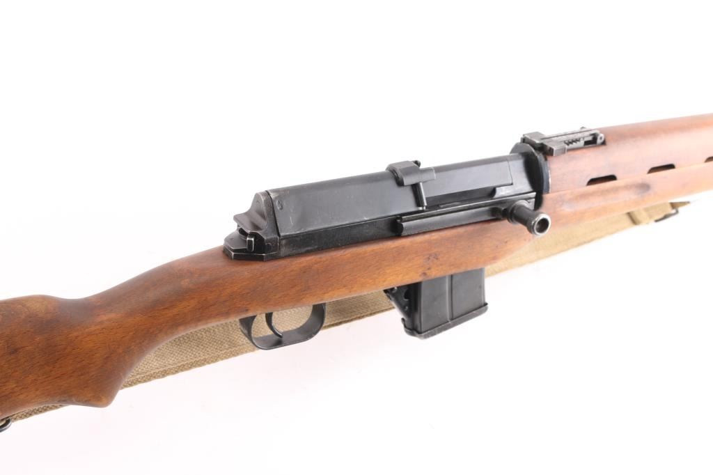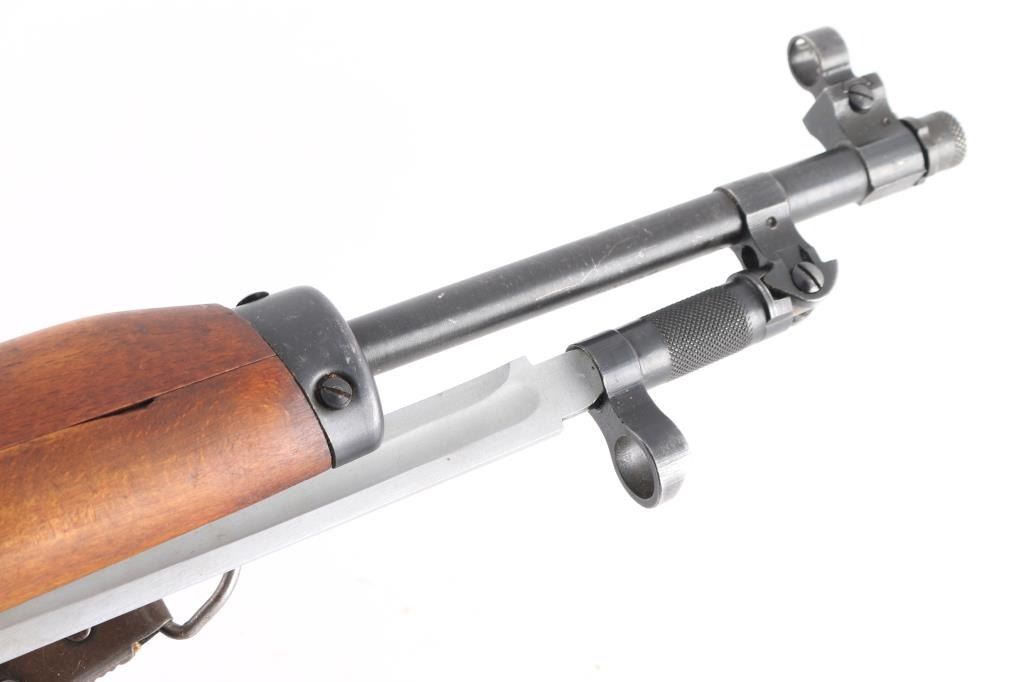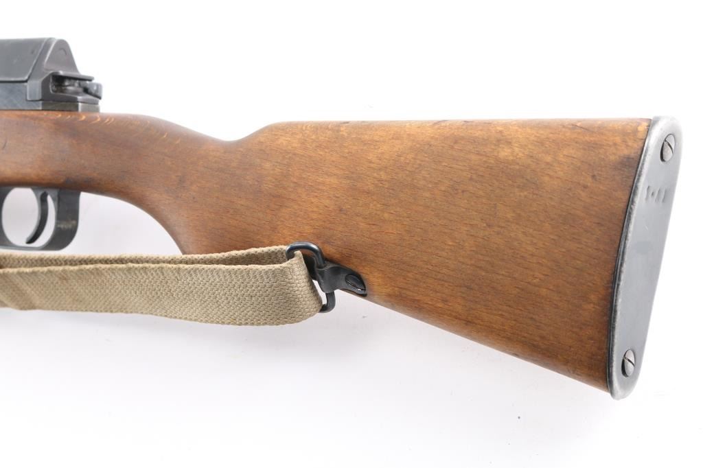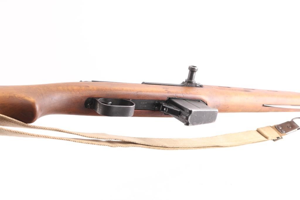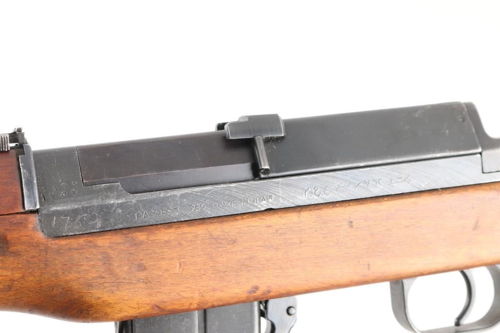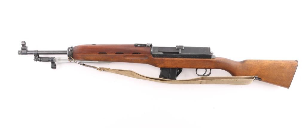 Egyptian Military semi-automatic carbine, derived from the Hakim rifle. Only about 8,000 were made. Manufactured by the Ministry of military production, factory 54. Direct impingement, gas-operated action. Fed from a 10-rd removable box magazine, with a latching mag release catch. SKS Style fold-down 9.5" bayonet attached. Adjustable rear sights marked in Arabic. 20.5" threaded barrel with cap, with hooded elevation adjustable front sight post. Thumb safety on rear of receiver, Bore is excellent bright. Blued metal finish, hardwood stock, and hand guard. Steel butt plate. Blued metal finish is about 85%, with some edge wear, minor scratches. Wood is very good/sound. Action is crisp/tight. Proper tan canvass sling attached. Manufactured in the 1960's