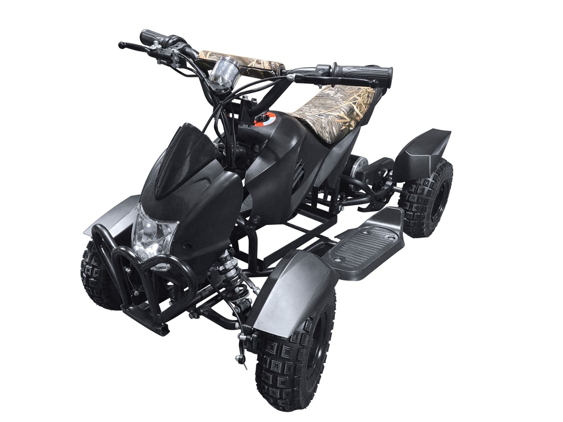 A great electric quad ATV featuring DU Mossy Oak Shadow Grass Habitat camo seat and handlebar pad and DU logos on the tank and rear fender. With a max speed of 18 mph, the ATV runs at 800 watts and includes three rechargeable 12v batteries. For children up to age 12 with a weight limit of 110 lbs.