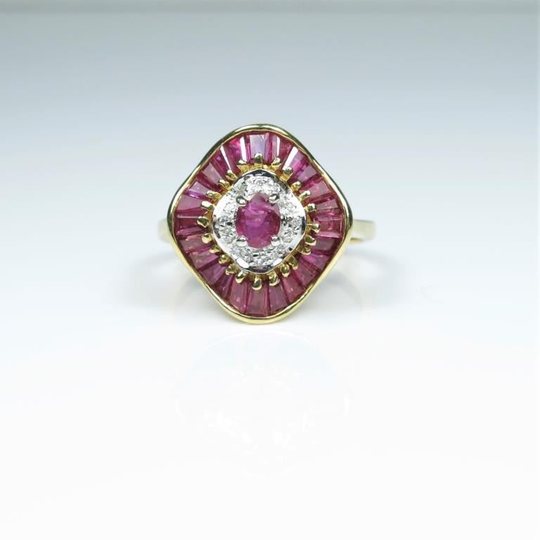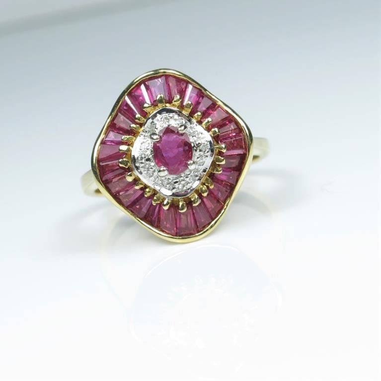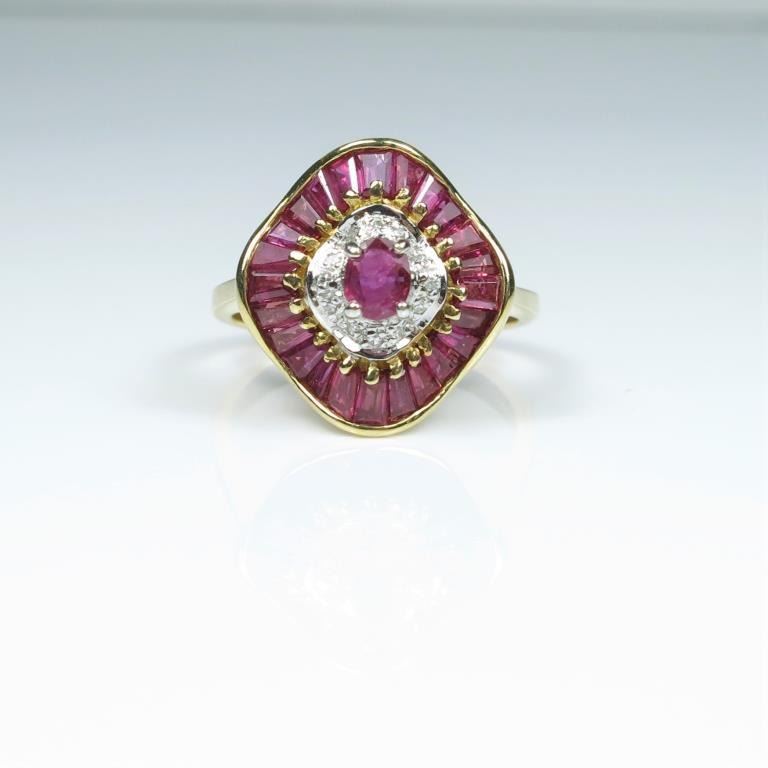 featuring oval and 24 baguette cut Fine Rubies accented with round cut Diamonds with a combined gem weight of approx. 2.00 carats set in 14 karat yellow gold.