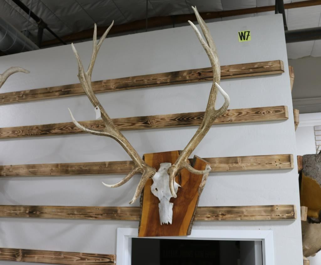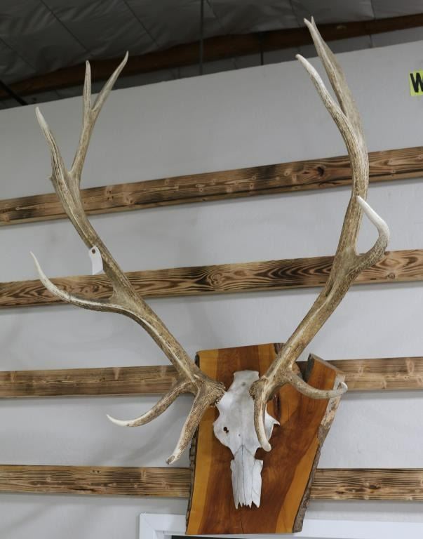 Measures: 57"H X 35"W X 24"D. Partial skull mount with antlers mounted on wood plaque. 6X6 points