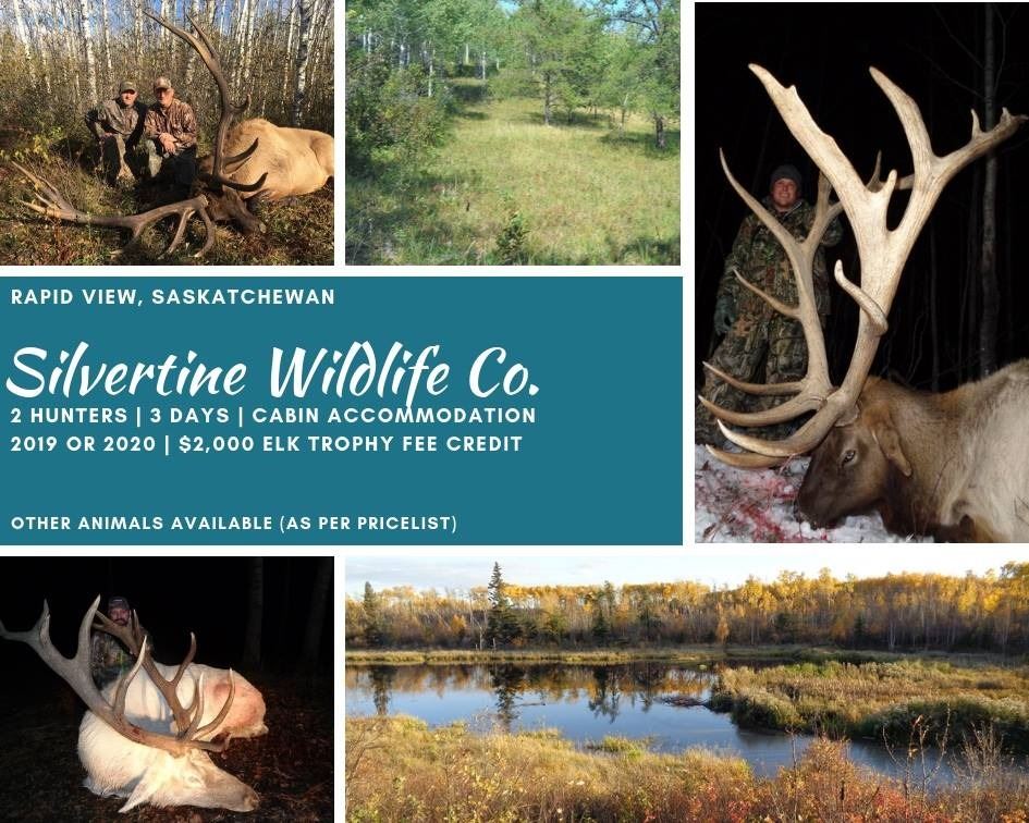 2 hunters, 3 days, Cabin Accommodation, $2000 elk trophy fee credit, 2019 or 2020, $3500 value Excluded: Travel to Lodge, gratuities, Gun Hire $50/day, additional animals as per price list