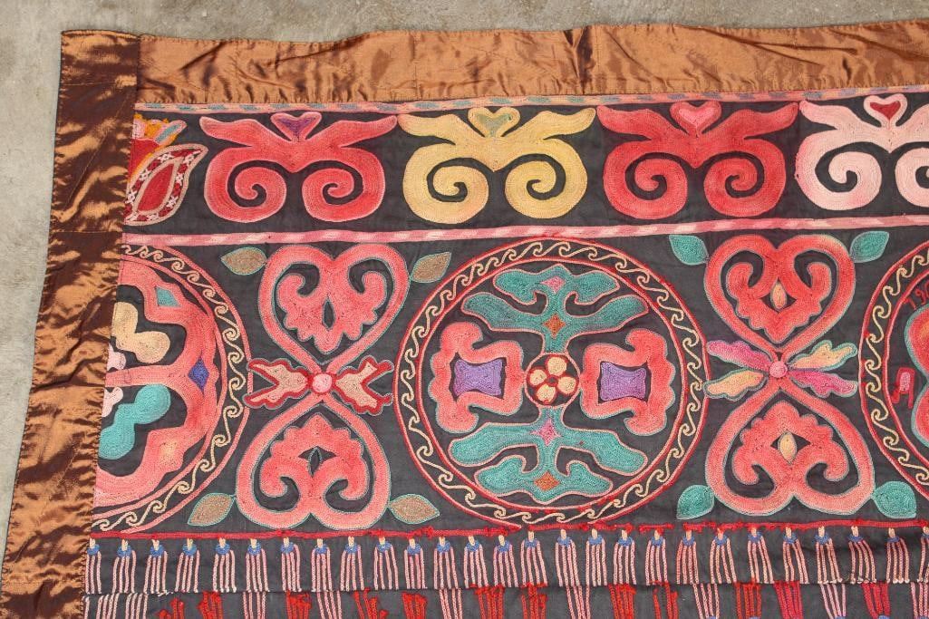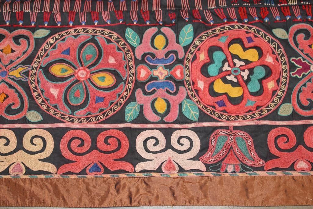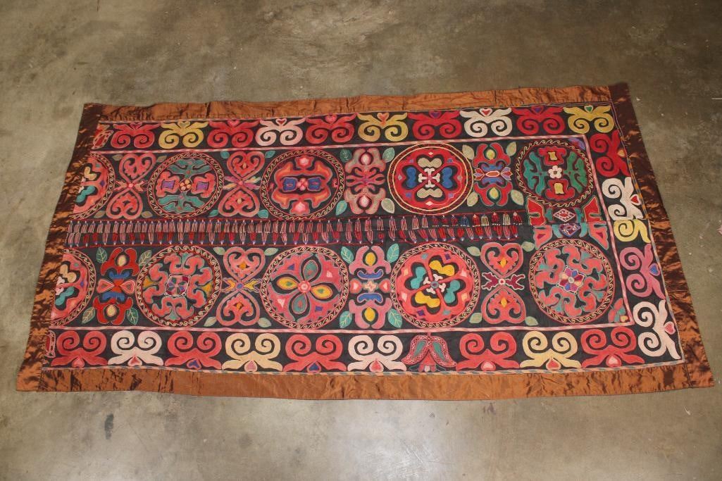 Beautiful embroidered Suzani Tapestry. It measures 75" Long x 35.5" Wide. Suzanis are a decorative tribal textile made in Tajikistan, Uzbekistan, Afghanistan and other Central Asian countries. Suzanis were traditionally made by Central Asian brides as part of their dowry, and were presented to the groom on the wedding day. COLLECTIBLE ASIAN TEXTILES