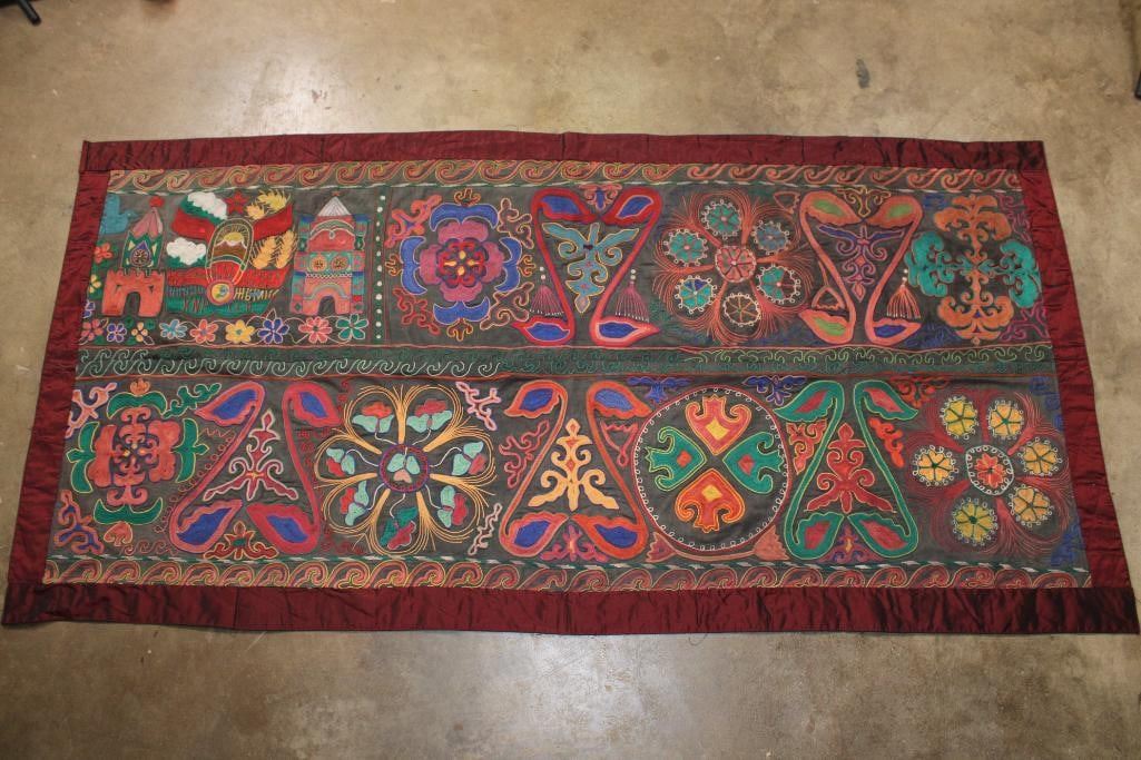 Lovely embroidered Suzani Tapestry. It measures 71" Long x 35" Wide. The primary use of a suzani was within the yurt (a Central Asian nomadic tent), as a protective wrapping panel for textiles and belongings. They were also used as prayer mats and for seating. COLLECTIBLE ASIAN TEXTILES