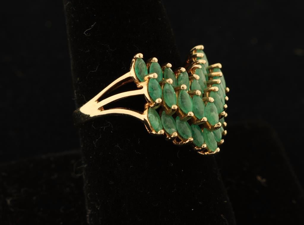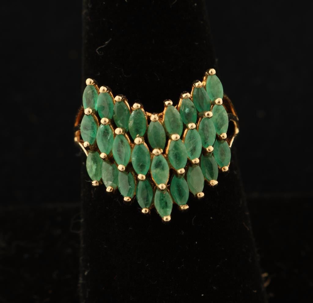 Three rows of 9 marquise cut emeralds in a cascading 'V' pattern in a 10K yellow gold setting. (27 total stones) Fabulous sparkle.