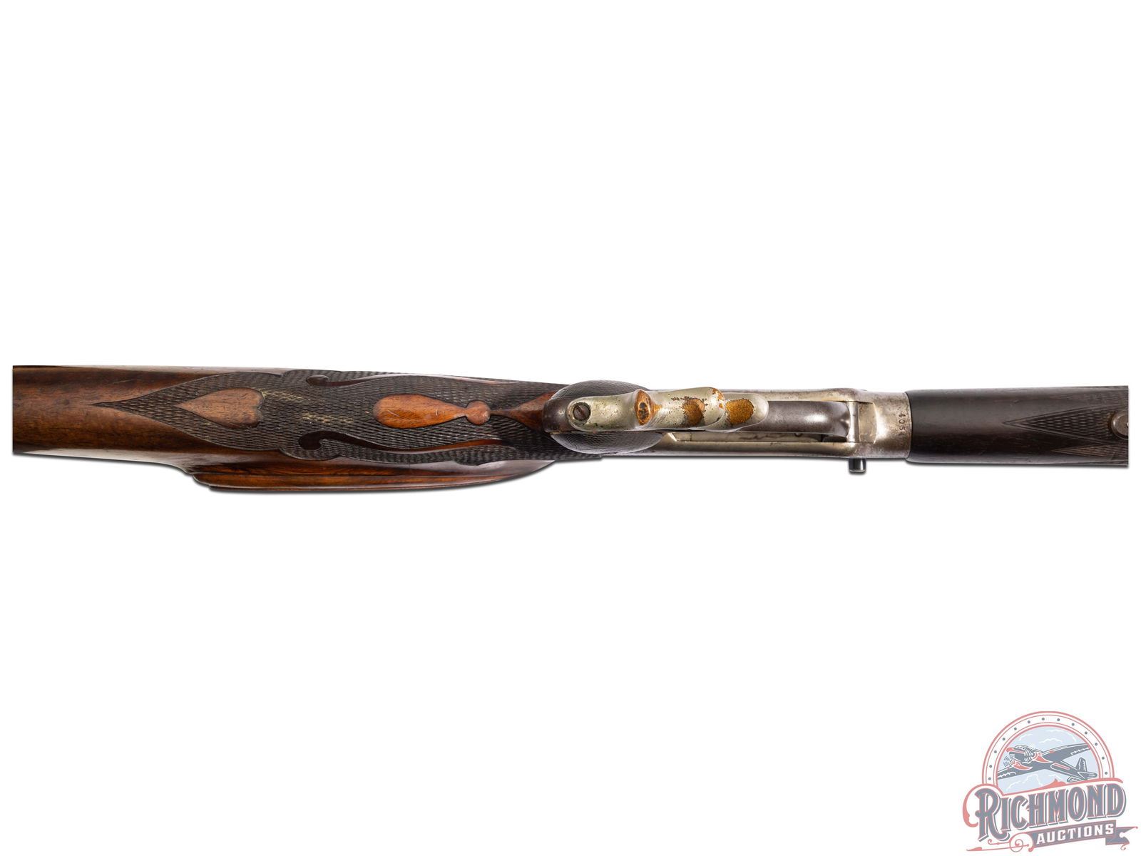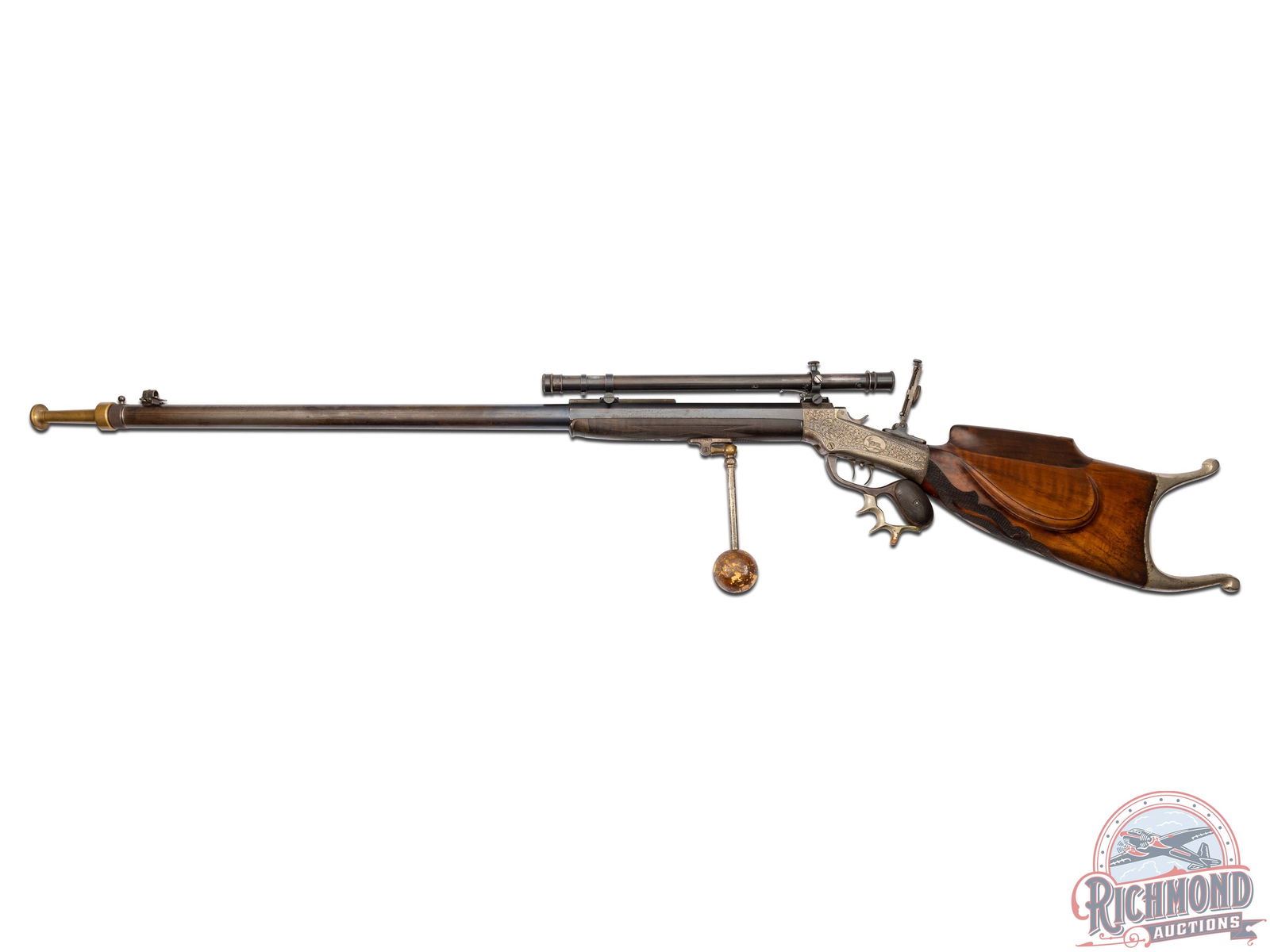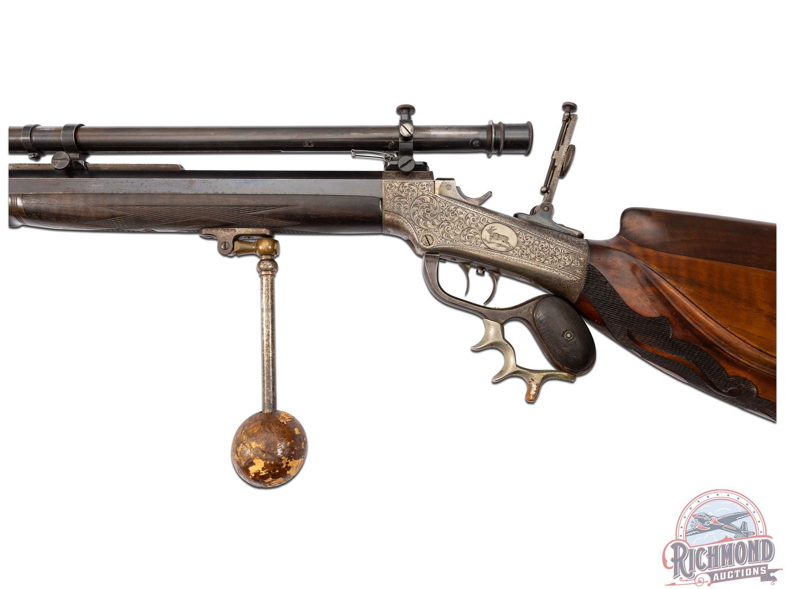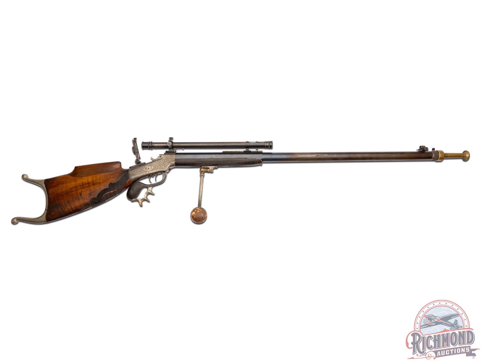 This rifle originally belonged to Emil Berg, whose family was well known throughout the Schuetzen world as excellent shooters and gunsmiths. Gun was originally made circa 1880 by Marlin as a No. 6 rifle. Gun was fitted by Harry M. Pope with a blued No. 5 weight half round barrel in 32-40 caliber. Shooter equipped with a Wind gage front sight, Winchester A-5 scope and Vernier tang sight. Barrel is stamped "H.M. Pope Hartford, Conn" and has Pope rifling code "21/1.41" under forearm. Pope style false muzzle and bullet starter are marked "383". Case-hardened action with Nimscke style floral engraving featuring a running deer on left side and crossed rifles and bullseye on the right. Action is fitted with Schuetzen double set triggers and Berg manufactured three finger spur lever with wooden loop insert. Walnut checkered with hearts and teardrop Perch-belly Schuetzen stock with Schuetzen cheekpiece and added comb piece. Butt stock is also fitted with nickel plated Helm butt plate with stock work done by Berg. Matching walnut checkered splinter forearm with horn tip, fitted with Berg palm rest with cork knob. Rifle comes with Pope grease pump initialed "E.B.". Pictured in Warren Greatbatch's book "H.M. Pope Harford 1887-1901" on pages 364-367. Includes an old W&C Scott catalog dated 1872 and signed in pencil "H.Berg" with shooting match clippings from 1878 to 1918. J.T. Livengood Collection. CALIBER: 32-40. S/N: 4054. FFL STATUS: Antique.