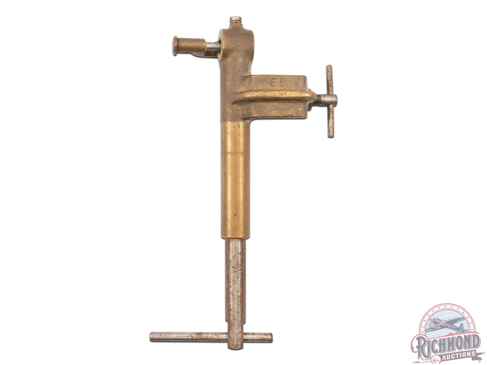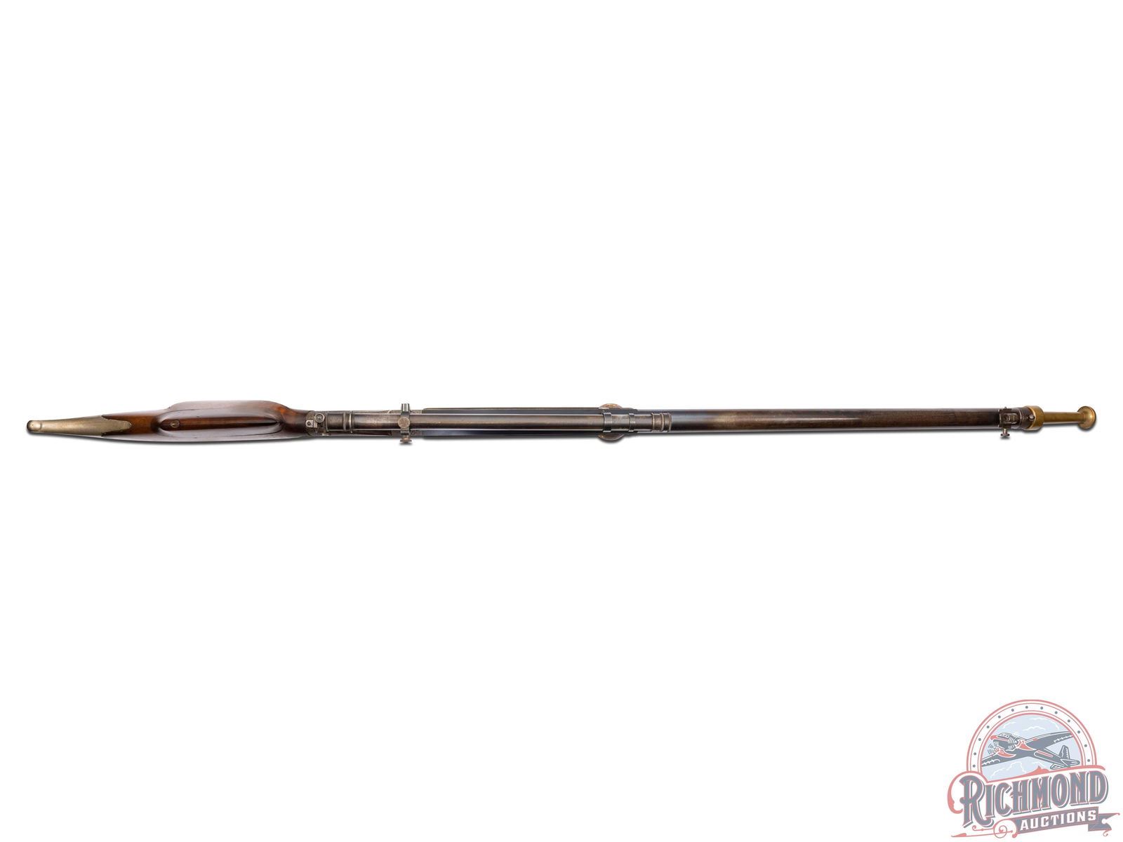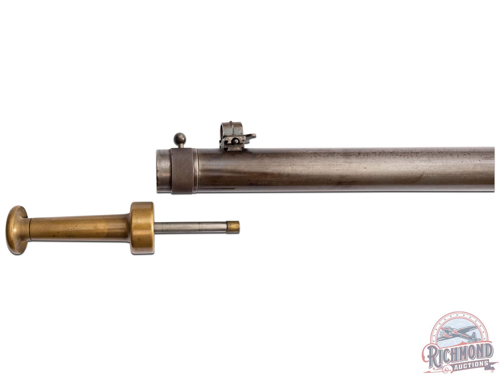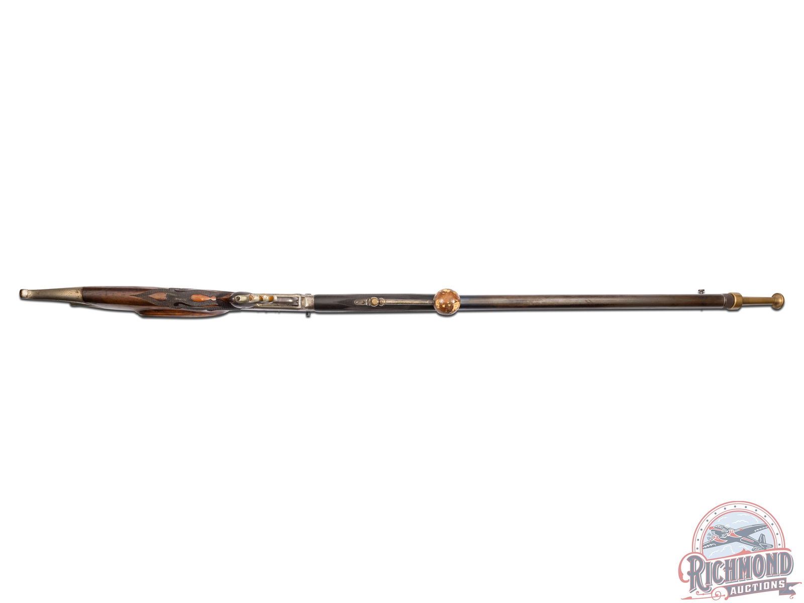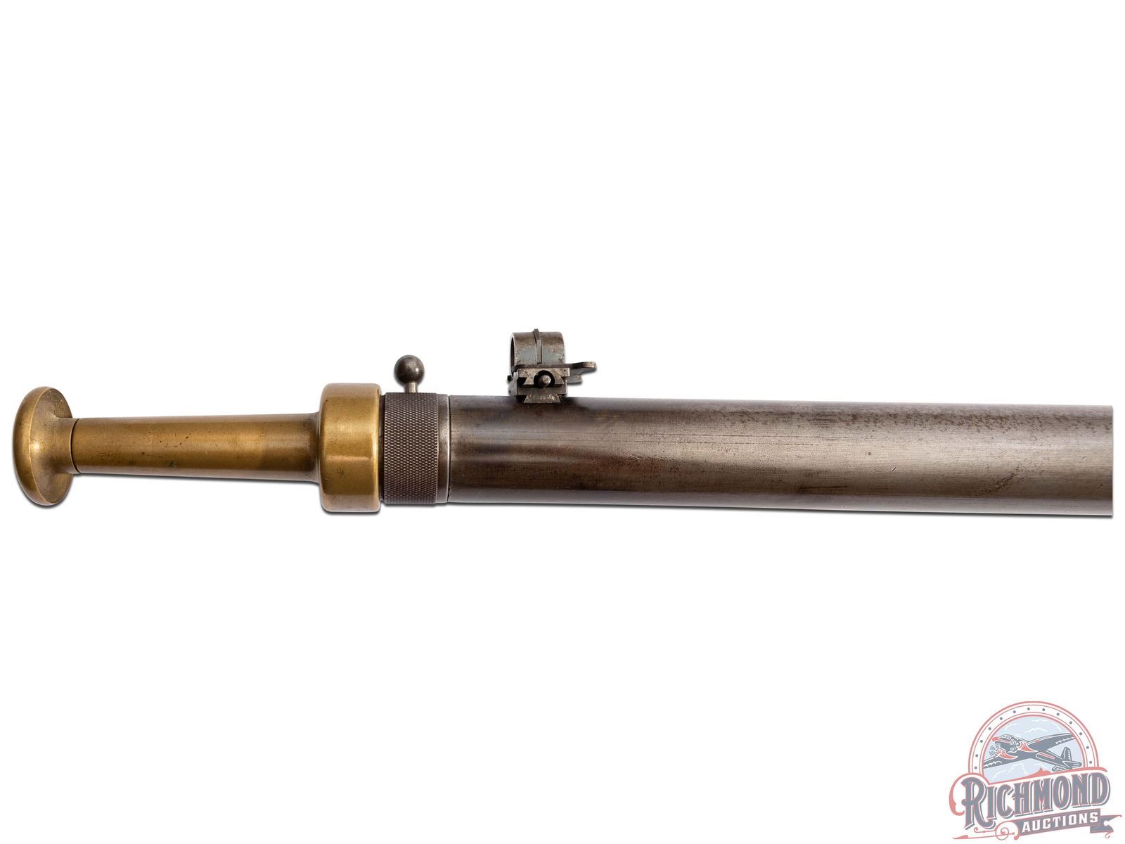 This rifle originally belonged to Emil Berg, whose family was well known throughout the Schuetzen world as excellent shooters and gunsmiths. Gun was originally made circa 1880 by Marlin as a No. 6 rifle. Gun was fitted by Harry M. Pope with a blued No. 5 weight half round barrel in 32-40 caliber. Shooter equipped with a Wind gage front sight, Winchester A-5 scope and Vernier tang sight. Barrel is stamped "H.M. Pope Hartford, Conn" and has Pope rifling code "21/1.41" under forearm. Pope style false muzzle and bullet starter are marked "383". Case-hardened action with Nimscke style floral engraving featuring a running deer on left side and crossed rifles and bullseye on the right. Action is fitted with Schuetzen double set triggers and Berg manufactured three finger spur lever with wooden loop insert. Walnut checkered with hearts and teardrop Perch-belly Schuetzen stock with Schuetzen cheekpiece and added comb piece. Butt stock is also fitted with nickel plated Helm butt plate with stock work done by Berg. Matching walnut checkered splinter forearm with horn tip, fitted with Berg palm rest with cork knob. Rifle comes with Pope grease pump initialed "E.B.". Pictured in Warren Greatbatch's book "H.M. Pope Harford 1887-1901" on pages 364-367. Includes an old W&C Scott catalog dated 1872 and signed in pencil "H.Berg" with shooting match clippings from 1878 to 1918. J.T. Livengood Collection. CALIBER: 32-40. S/N: 4054. FFL STATUS: Antique.