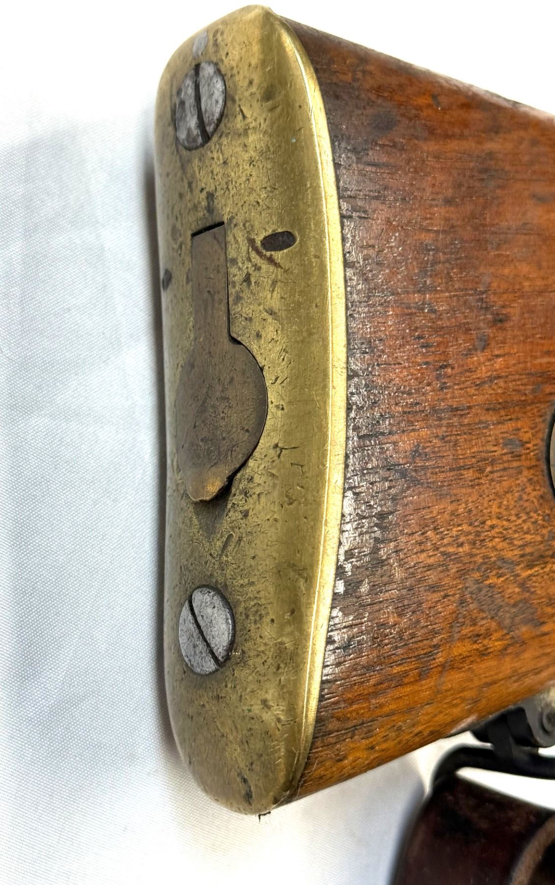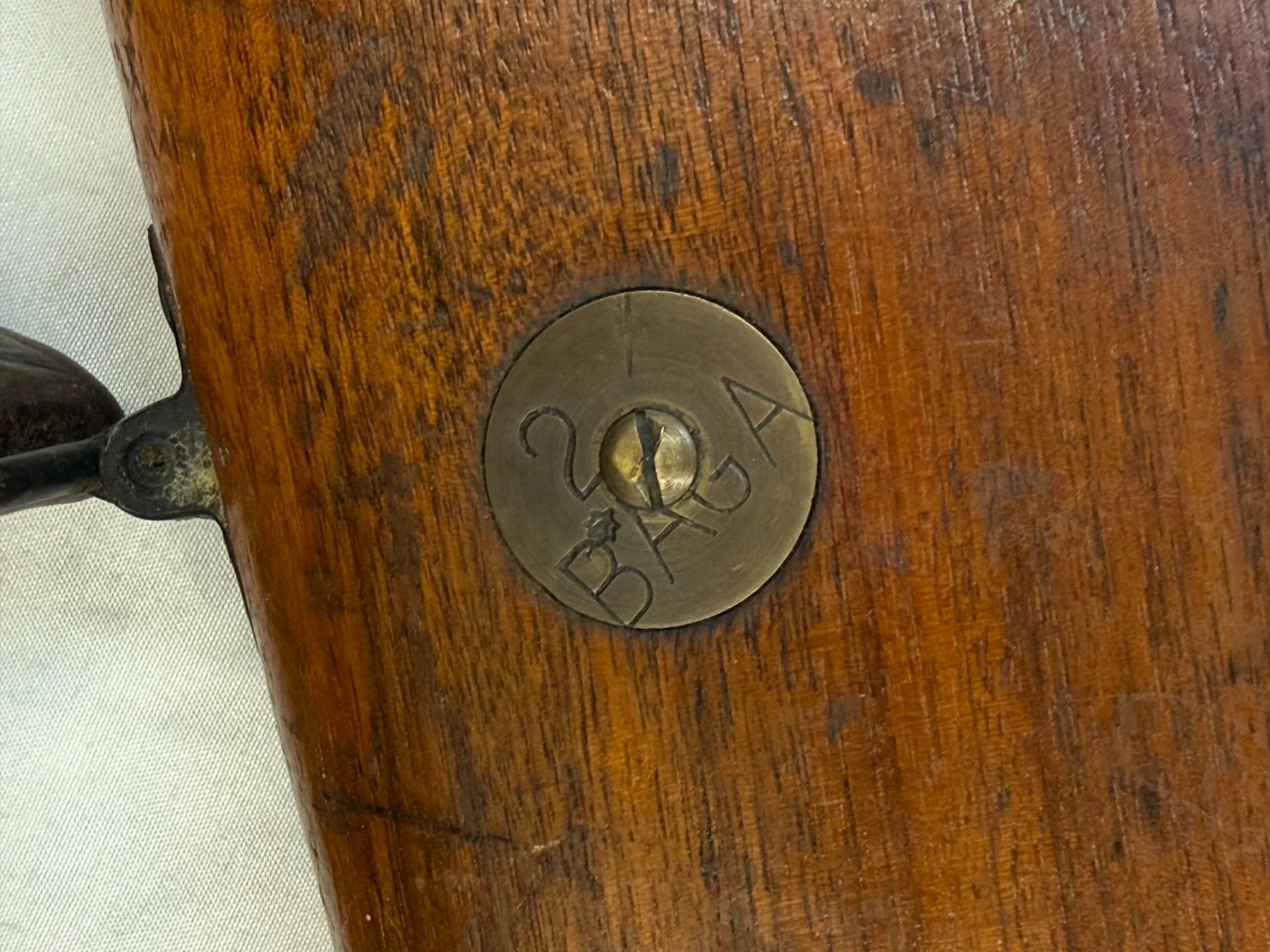 Original rear stock has brass disc and brass butt plate. Disc has 2 BAGA stamped on it.