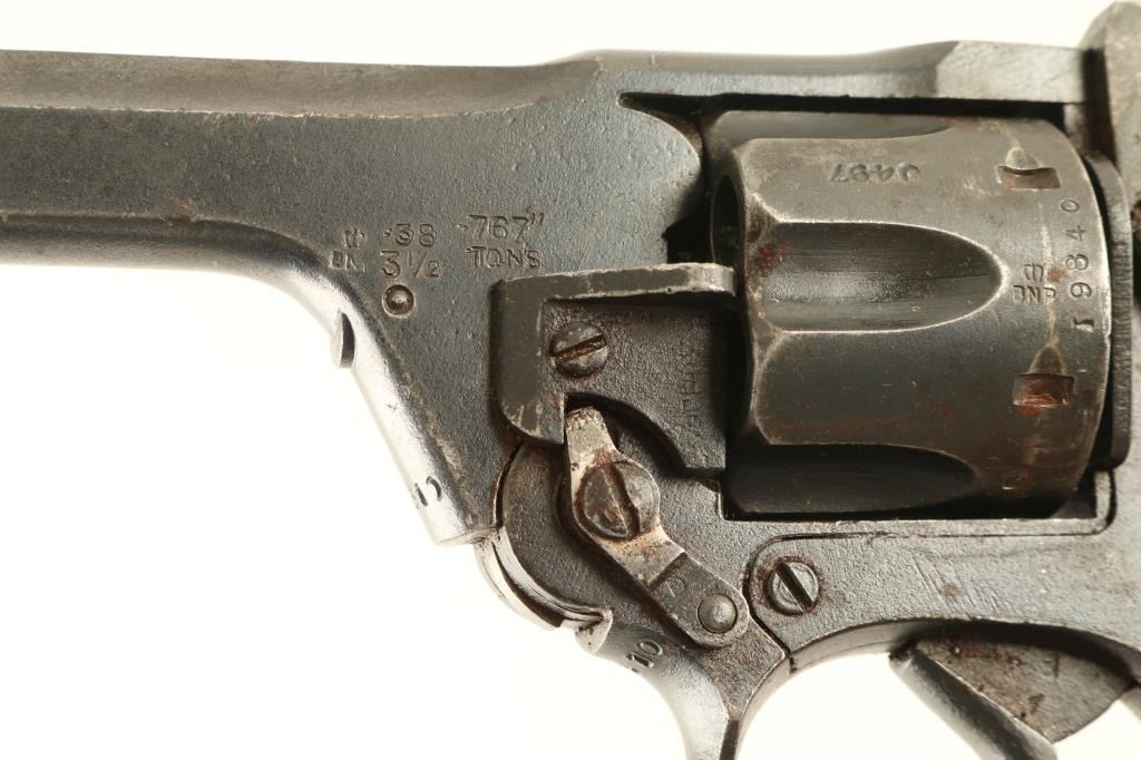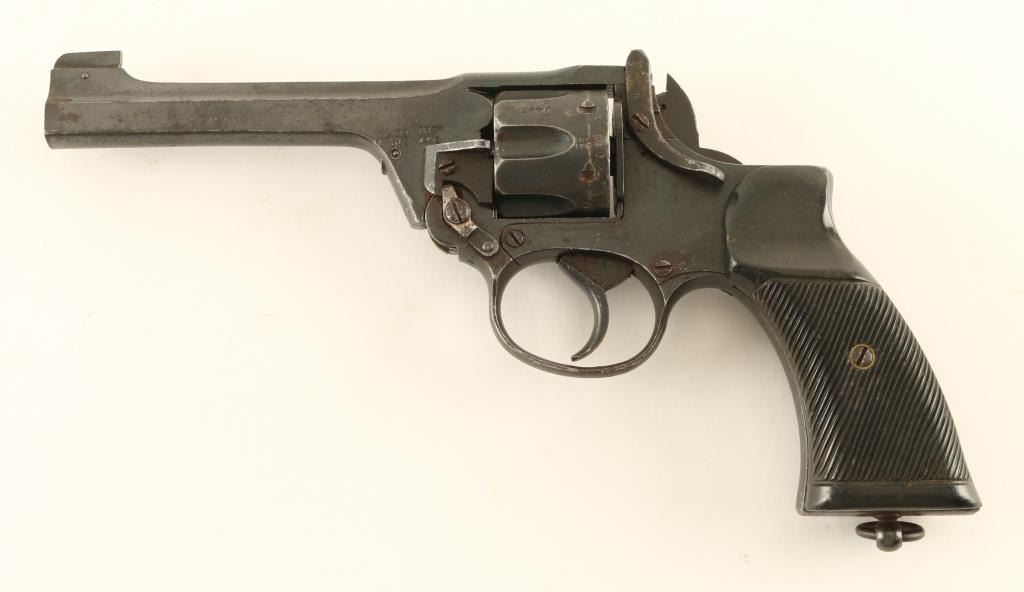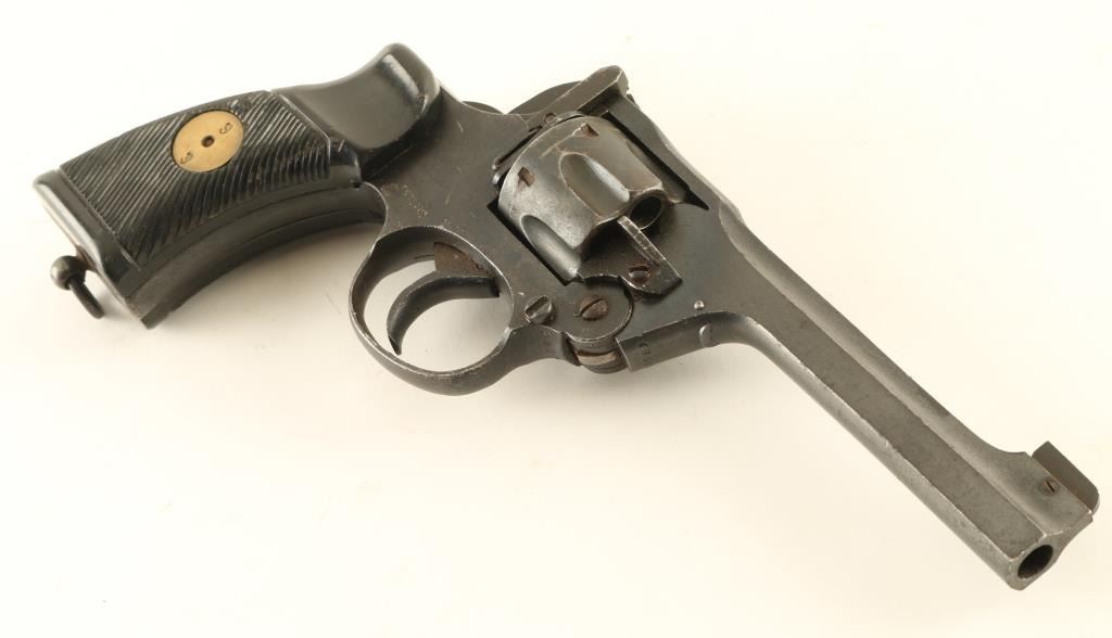 British military revolver features double action only operation, blued finish, black plastic grips, 5” barrel, top break with automatic ejection, lanyard ring at butt. Bore and cylinder charge holes are in very good condition. Retains 85% arsenal refinish on metal parts, with bare metal on sharp edges and small areas turning brown with rust or minor pitting. Action is smooth with tight lock-up. Condition is NRA Good+ (as refinished) *** C&R Firearm ***