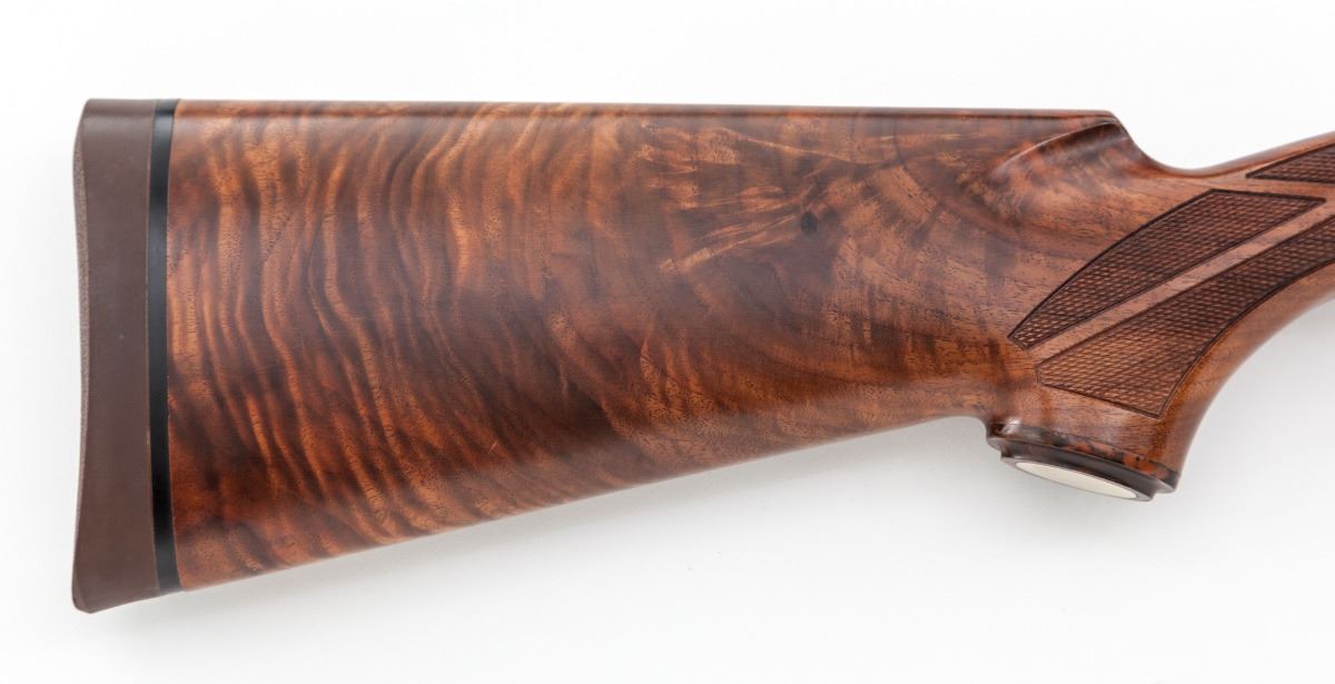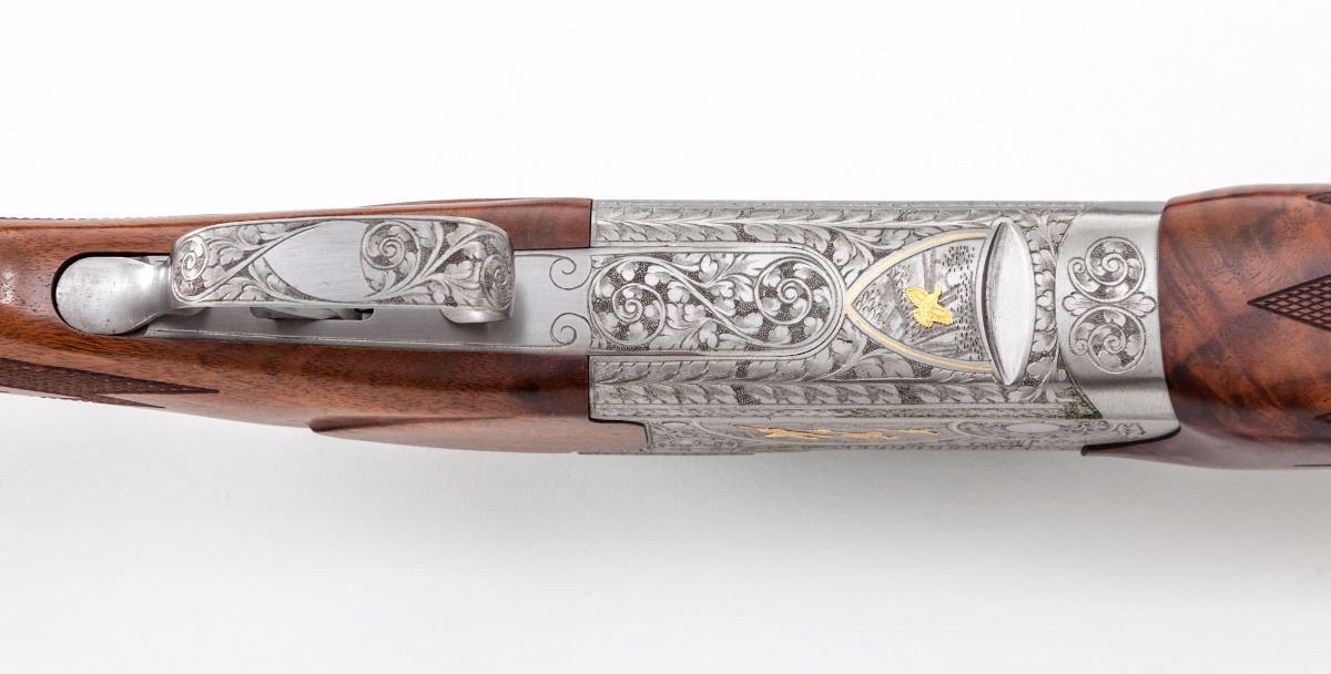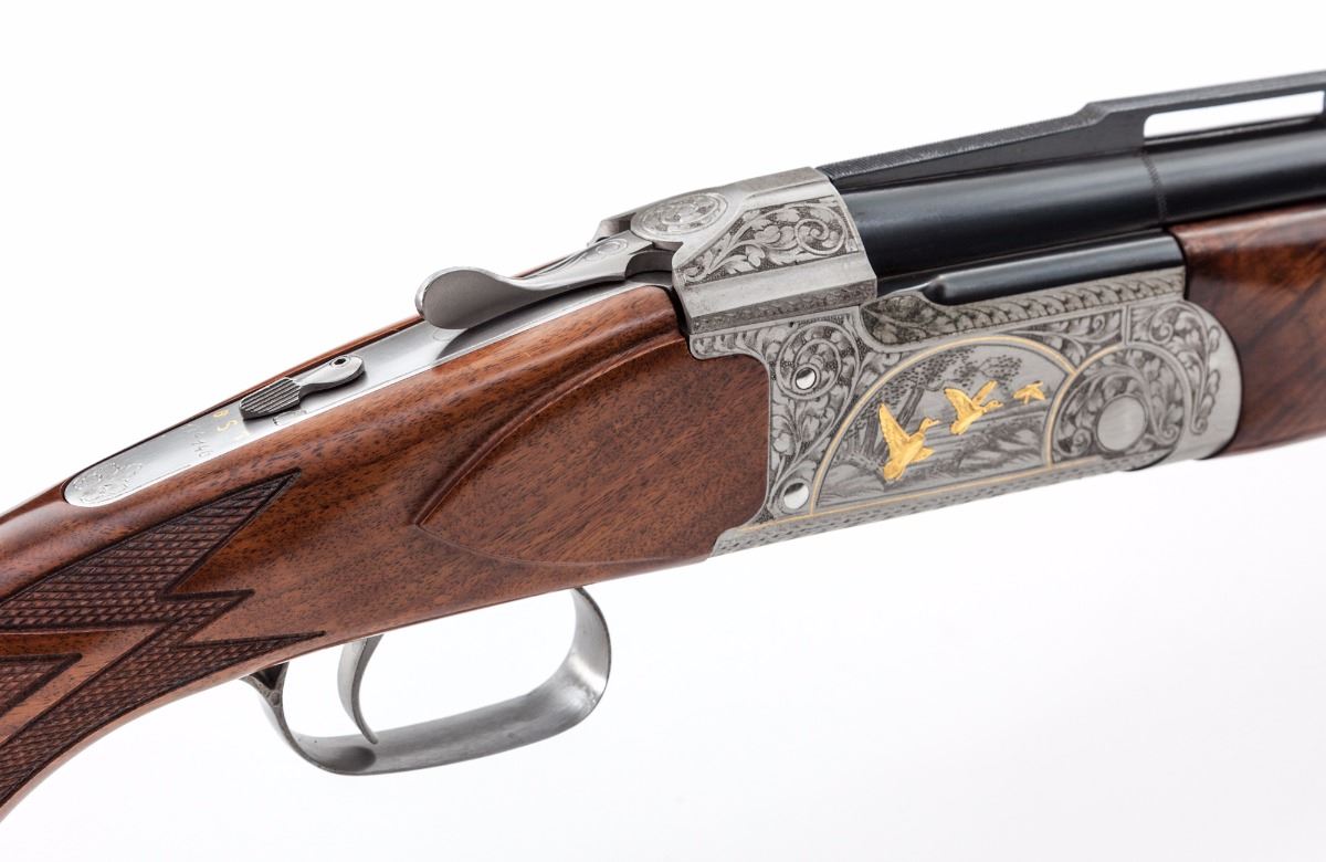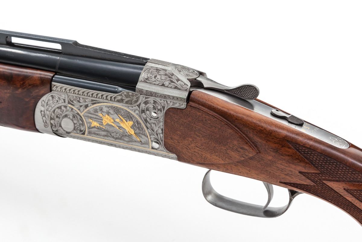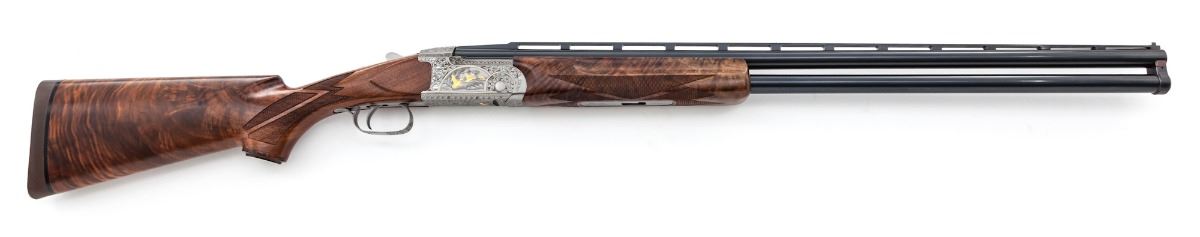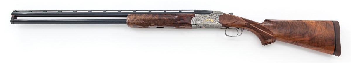 Rare High Grade Engraved and Gold Inlaid Remington Premier International Model 3200 Over/Under Trap Shotgun, #174146, 12 ga., 2-3/4'' chs., 30'' blue finish barrels with matted and stepped 5/16'' ventilated rib, front Bradley type white bead and steel middle bead; Full/I.M. chokes, with ejectors. Lower barrel has double date codes for 1974 and 1975. The fully Belgian engraved and finished bright nickel frame features large open vine scrolls surrounding woodland game scene panels with three gold inlaid pheasant on the left side and three gold inlaid ducks on the right side. Underside of frame has a single gold inlaid grouse; the three panels are outlined with gold wire inlays. Action has a single mechanical trigger with tang-mounted combination manual safety and barrel selector; frame has the later design updates. The AAA Grade pistol-grip walnut stock and target forend have a satin finish with sharp diamond checkering arranged in geometric patterns; pistol grip has a vacant gold initial oval inlaid in a simulated rosewood grip cap. Length of pull is 14-1/4'' over a solid brown Remington recoil pad, drop at comb is 1-3/8'', drop at heel is 1-5/8'' and weight is 9 lbs. Condition is excellent, appearing to have been fired occasionally, with a few light handling and assembly marks. Bores and action have light fouling; barrel hanger wedge has plum discoloration. Est.: $4,000-$6,000. (Modern)