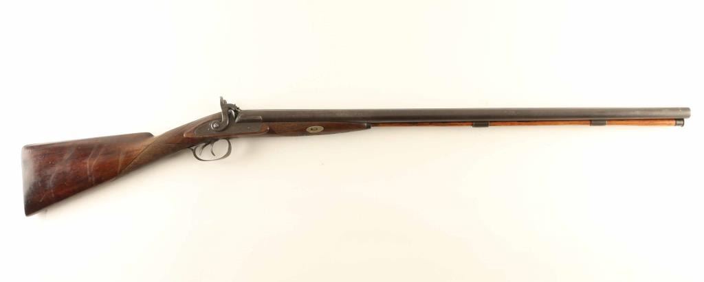 Shotgun. Percussion. 32" barrels with 2 porcelain sighting beads. Exposed hammers. Barrel rib marked "London" Wood, brass-tipped ramrod in place. 2-cock hammers lock-up tight. Double triggers. Hardwood stock, with checkered wrist, and forearm. Steel butt plate. Bores appear good, dusty. Wood is good, with some finish handling loss. Minor scratches/dings. Metal finish has turned a dull plum/gray color. This shotgun is very similar in appearance to ones made by Henri Pieper of liege, Belgium, for import to England, circa 1860-1898. NRA condition-Very Good. Antique Firearm.