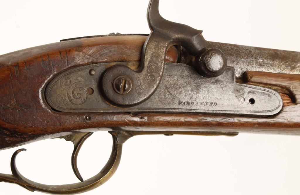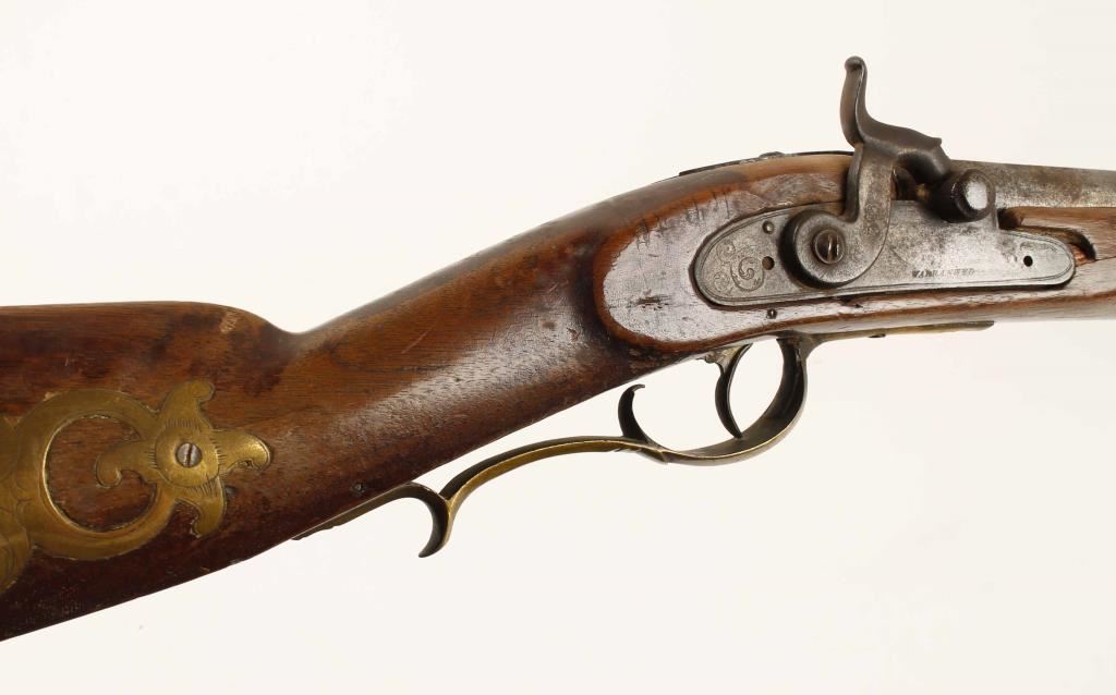 Formerly a half stock plains rifle converted to a percussion rifle. Features a 30.5" heavy octagonal barrel, brass front sight, rear sporting sight, lightly engraved hammer, engraved lock marked "Warranted", fancy brass trigger guard, engraved ornate brass patch box and cut down stock with cheek piece. Finish shows an uneven grey/brown patina and stock is in rough shape. Action works. Condition is good as antique. ***Antique Firearm***