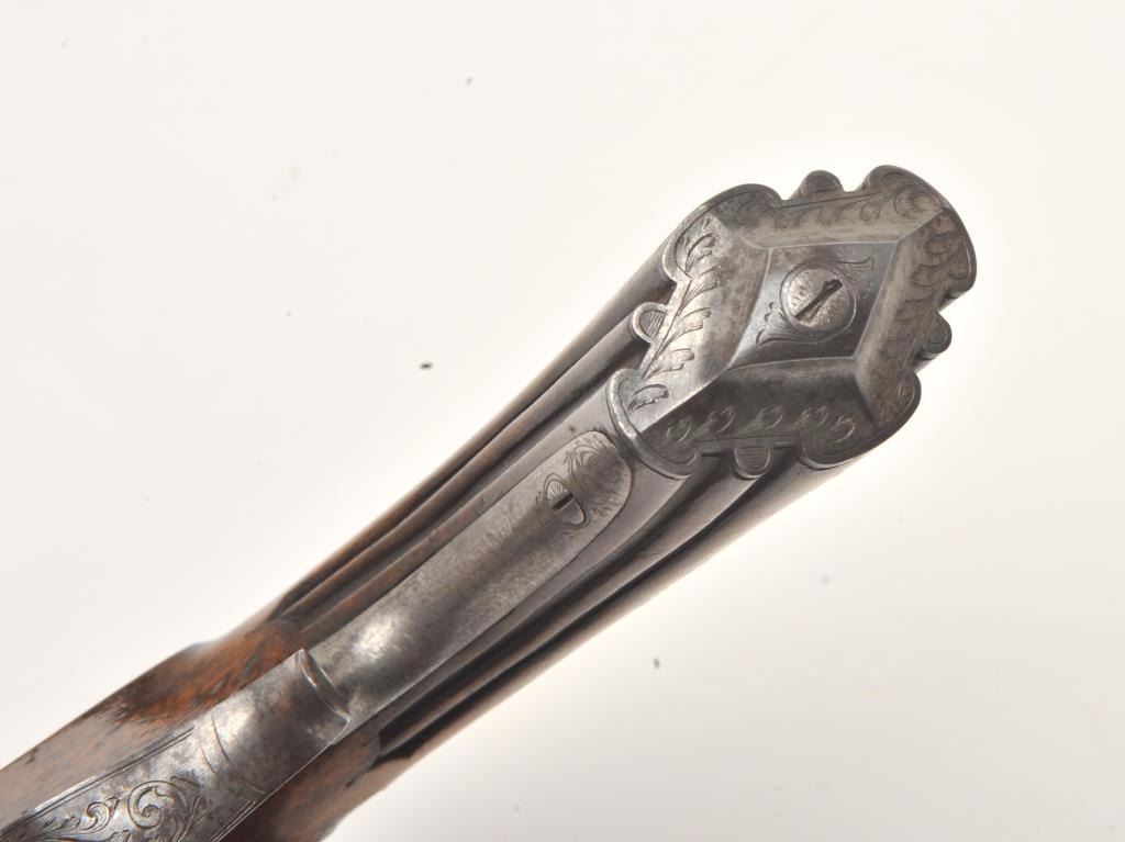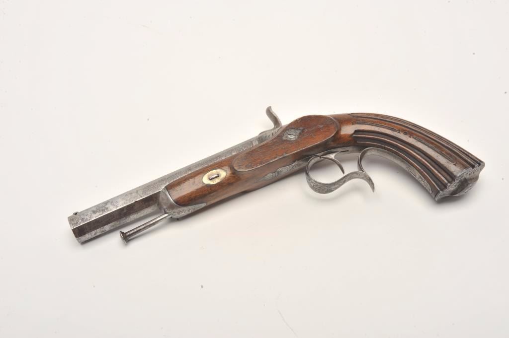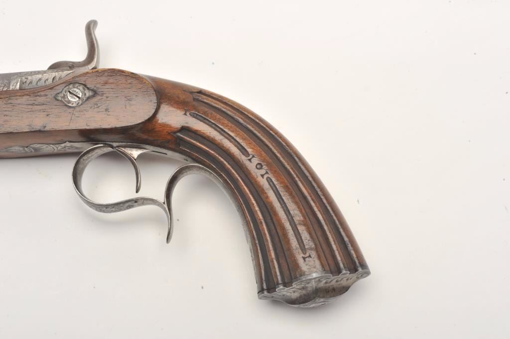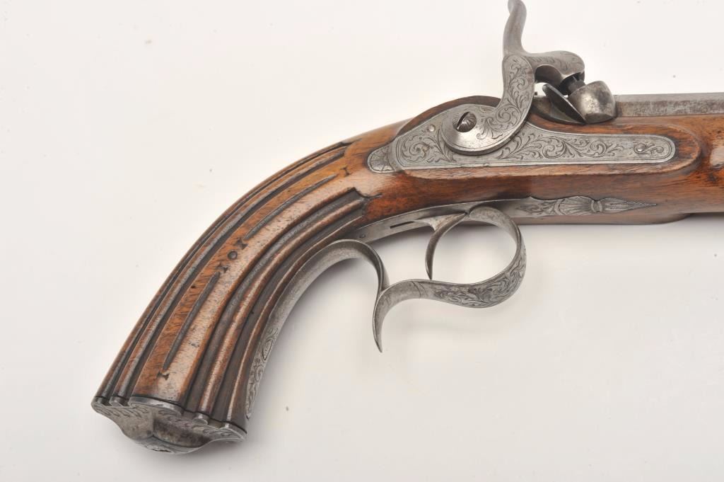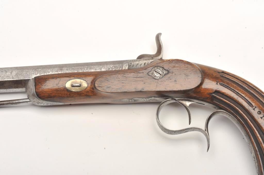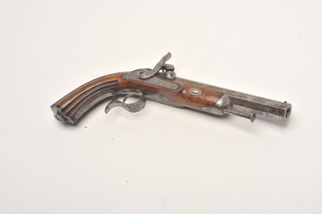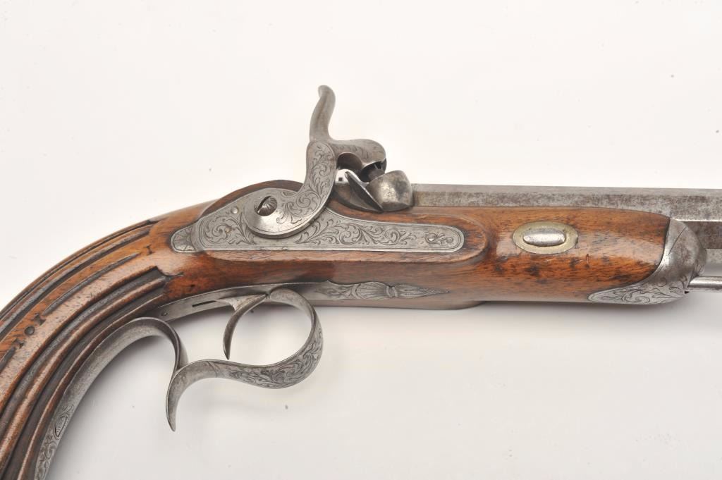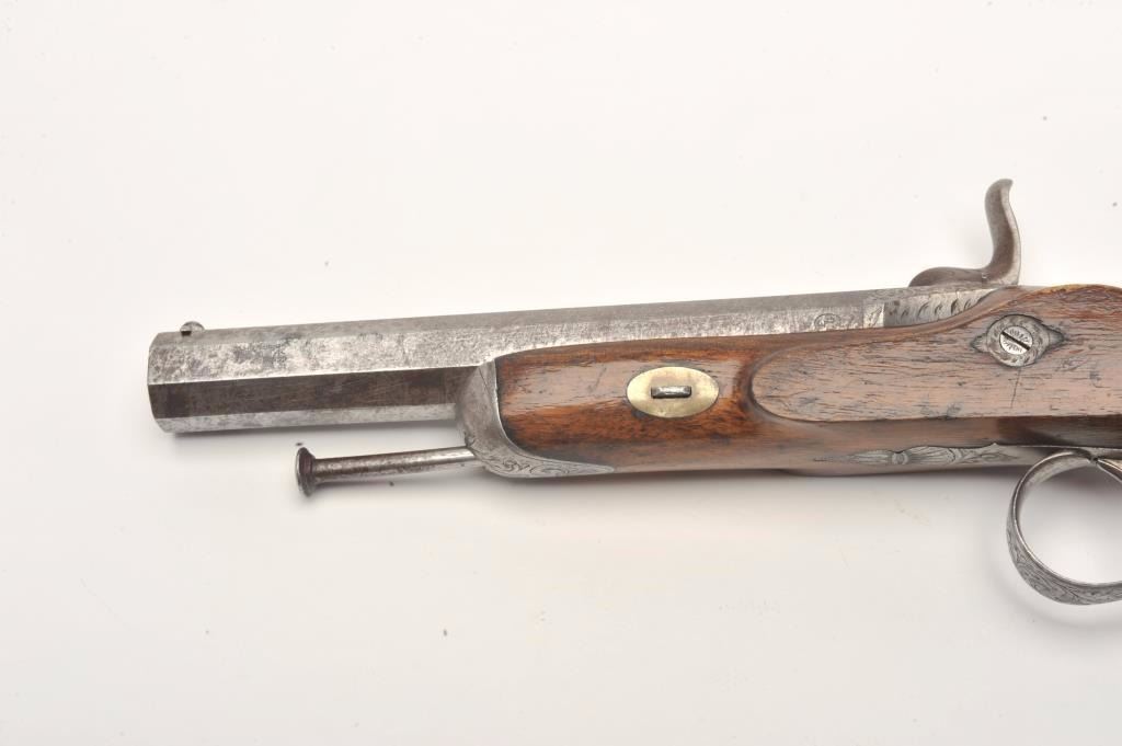 Engraved French percussion dueler/target pistol, .45 caliber, 7” octagon barrel, wood stock, No visible S/N, in overall good condition showing a grey patina to metal surfaces with scattered spots of erosion onbarrel, crisp action, no visible maker’s marks, good wood stock. (Antique). Est.: $200-$400.
