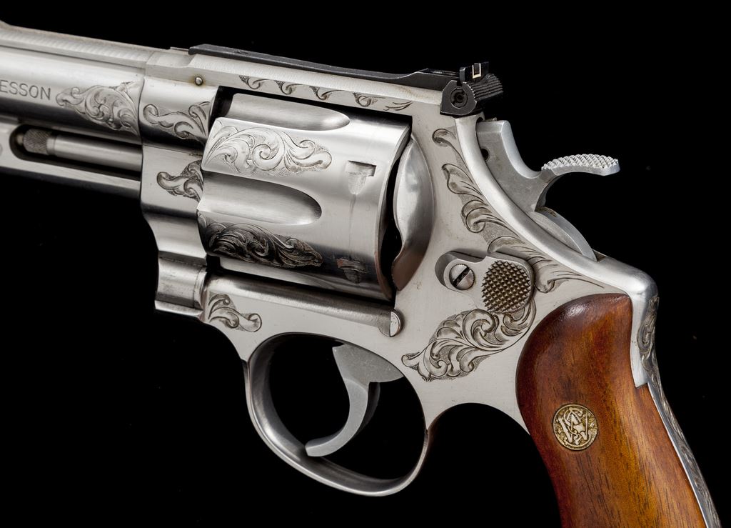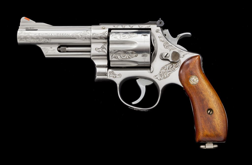 Engraved Smith & Wesson Model 629 Double Action Revolver, #N837772, .44 mag. cal., 4'' pinned and ported barrel, stainless steel, smooth wood grips with S&W medallions, checkered hammer, smooth trigger, red ramp front sight, white outline fully adjustable rear sight, with lanyard loop in butt. Portions of the barrel, frame, cylinder, triggerguard, and backstrap have been nicely scroll engraved with a punch dot background. Condition is fine showing signs of moderate use. Metal shows a small amount of scattered light marks from handling; cylinder with a moderate index line. Grips show a few minor impressions. Engraving and factory lettering are clean and clear. Action is smooth and crisp with a near excellent bore that shows normal light wear. Est.: $700-$1,000. (Modern/PPT)