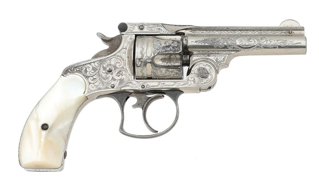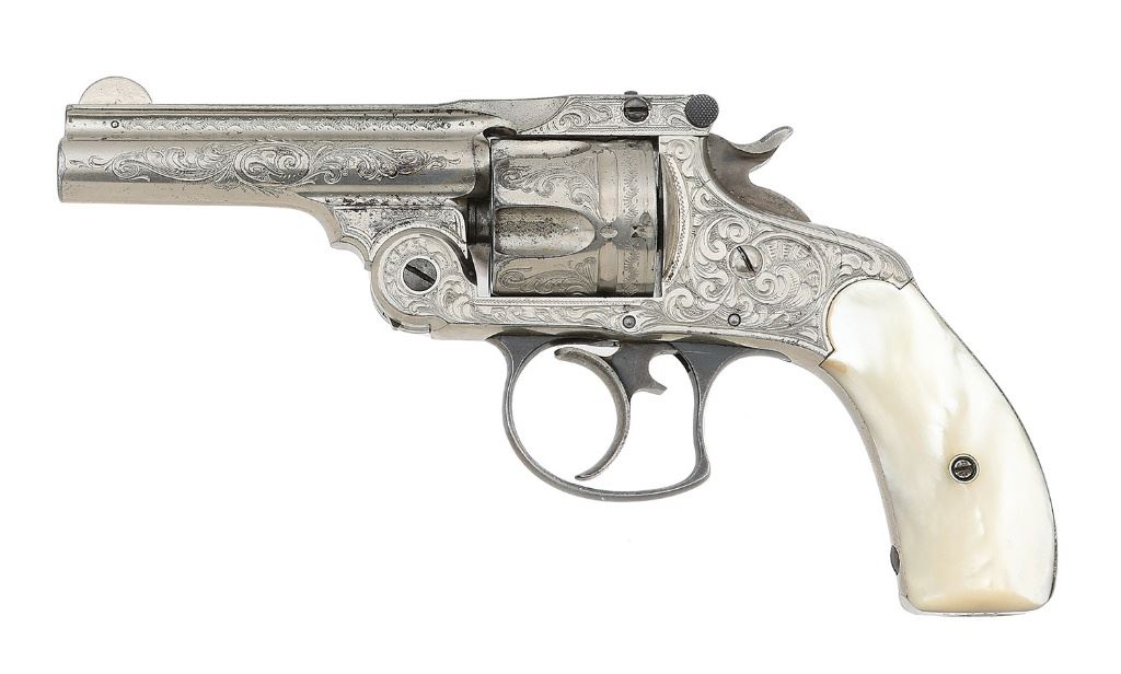 serial #17036, 38 S&W, 3 1/4'' barrel with a mostly bright very good bore showing some scattered pinprick pitting and old oxidation with strong rifling throughout. This revolver shows nice quality New York engraving in near full coverage featuring nice flowing foliate scrollwork with punch-dot shading and extensive zigzag borders. There is a subtle shell motif on the left side of the frame integrated into the scroll and a large flower behind the hammer. The metal surfaces retain about 92% original nickel finish with some scattered light flaking to mild gray-brown patina along the high edges and cylinder, and a bit of minor oxidation speckling. The triggerguard has mostly flaked to gray with some good original blue along the sides while the trigger and hammer retain good case-hardened colors. The smooth mother-of-pearl grips remain in near excellent condition showing some light handling marks. The grips are un-numbered and not quite perfectly fitted in some areas but this is relatively minor. The serialized parts are matching, barrel-to-frame fit is solid and the action seems to function well mechanically in both single and double action. (13C11199-41) {ANTIQUE} (1000/1500)