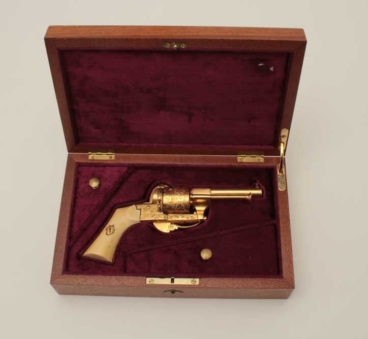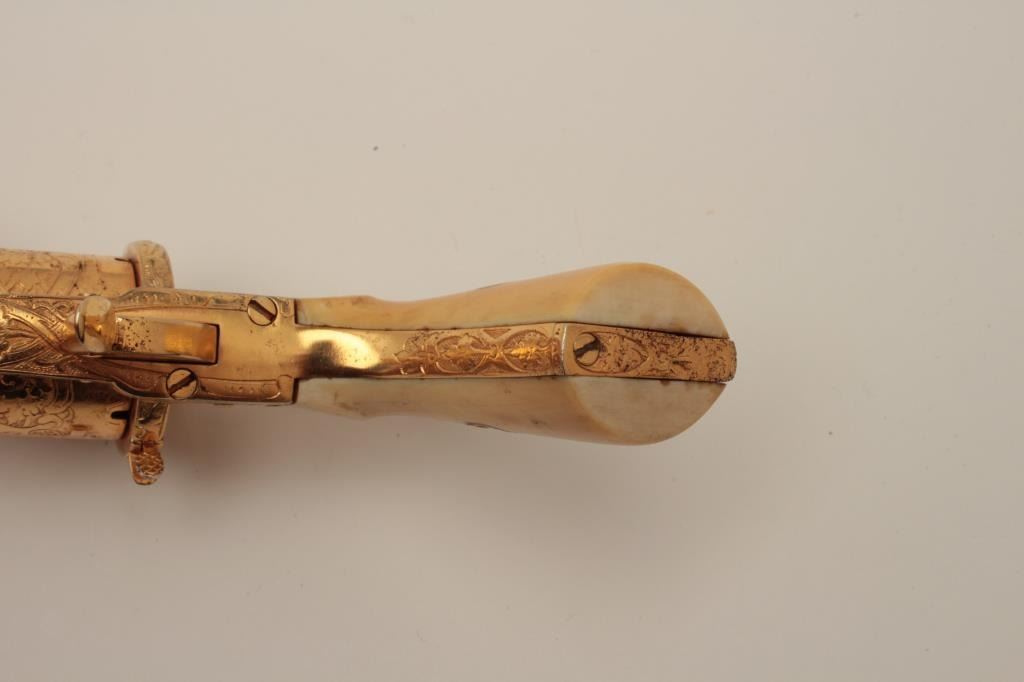 Engraved pinfire revolver, gold finish, ivory grips, S/N 62033, wood presentation casing; gun is in overall very good condition displaying the majority of its gold finish, exceptional floral engraving, good action,beautiful mellow ivory grips. (Antique). Est.: $600-$1,200.