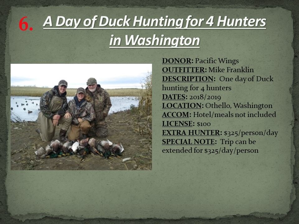 Enjoy a day of duck hunting in Othello Washington for 4 hunters in 2018 or 2019. Cost of extra hunter $350 per day. Hunting license-$100 per person. Trip can be extended for $350 per person per day. Excludes hotel and meals. Pacific-Wings.net