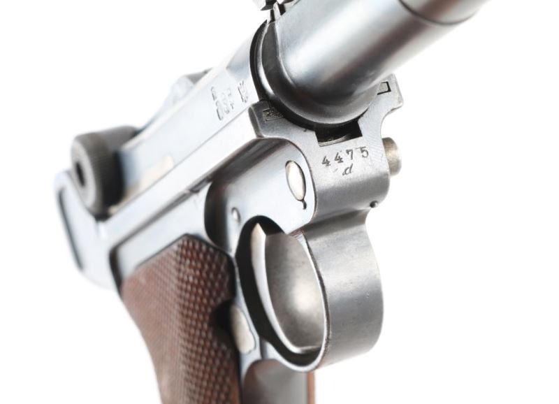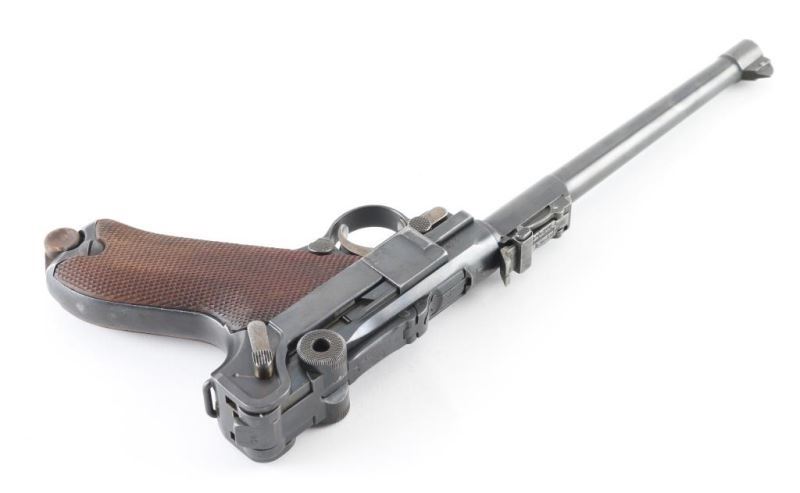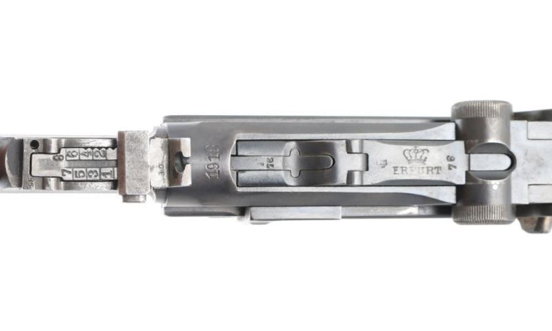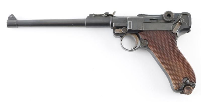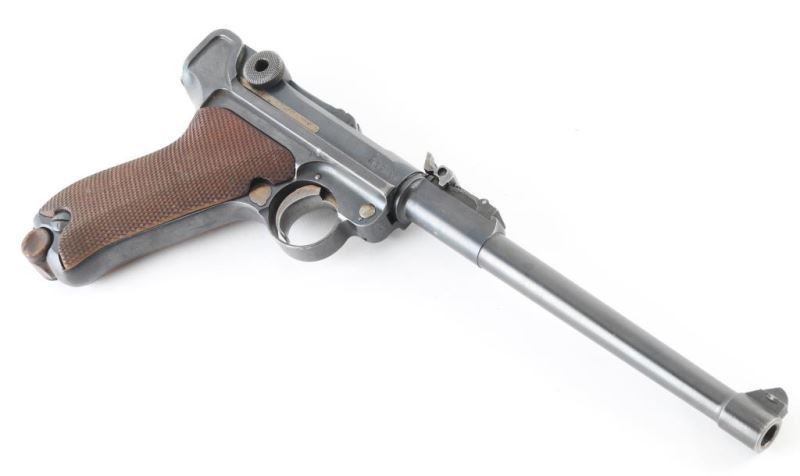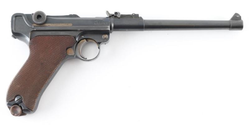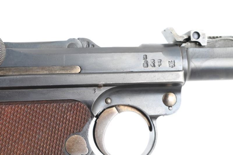 Pistol. Semi-Automatic. 8-rd magazine 'Artillery Luger' (LP08) Authorized by the Kaiser in 1913. Vintage WW1 German Armed Forces sidearm, intended for use by artillery units. Used up to the end of WW2. 1918 dated. Toggle-locked, short-recoil action. 7.9" barrel with rear 8-position tangent rear and front serrated blade front sights. Lanyard ring on rear of frame. No stock lug for shoulder stock. Many mismatched parts. Smooth rounded trigger. Toggle lever stamped "Erfurt" with crown. Numerous proof marks. Right frame stamped "Germany" Blued metal finish about 90% with edge wear, and scratches. There is some slight pitting on the left frame, and sideplate. Checkered wood grips are good. Bore appears excellent/bright. Toggle action is crisp/tight. Comes with correct wood plug magazine. Magazine is mismatched. Mag follower is pitted. Fore strap is Unit marked "1.H.1.7". NRA condition-Good.(Mismatched) C&R Firearm.