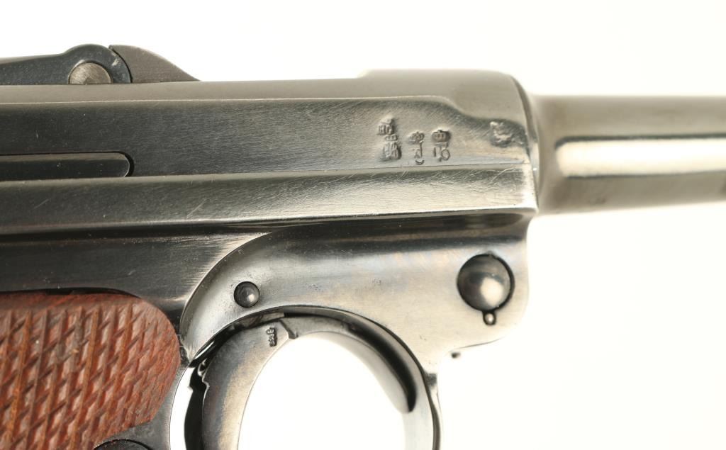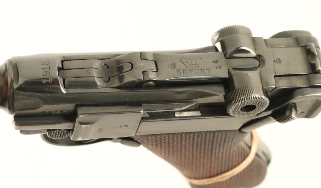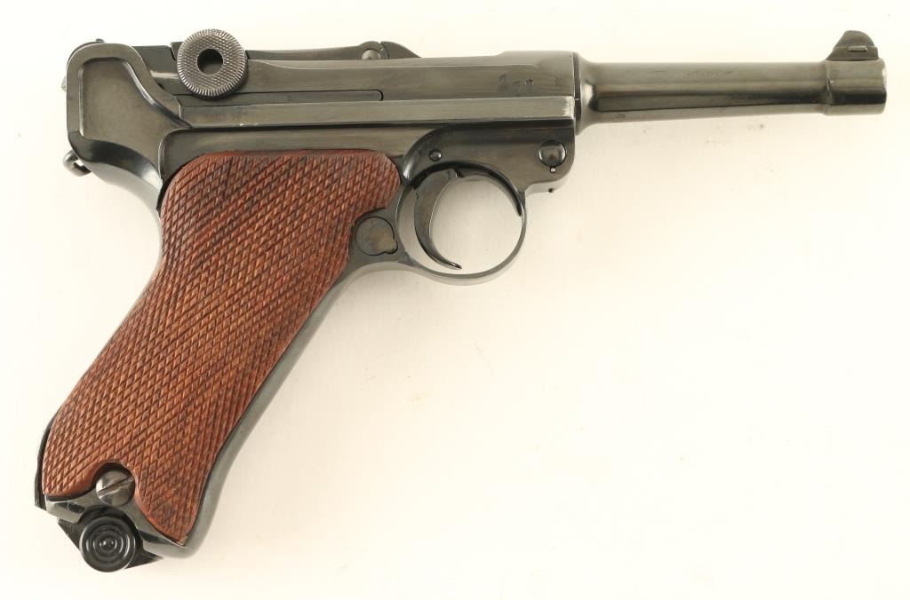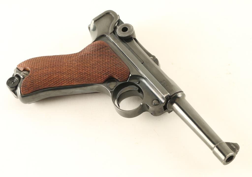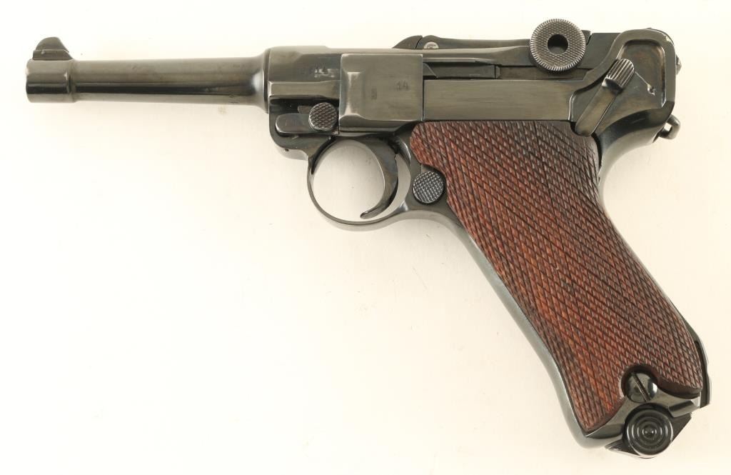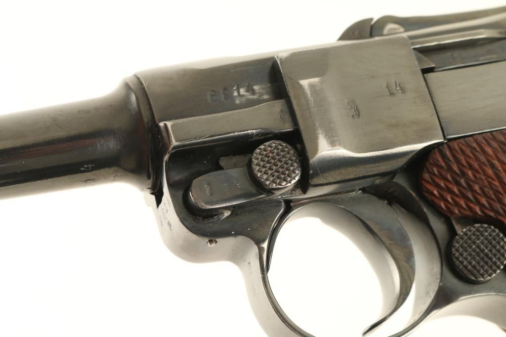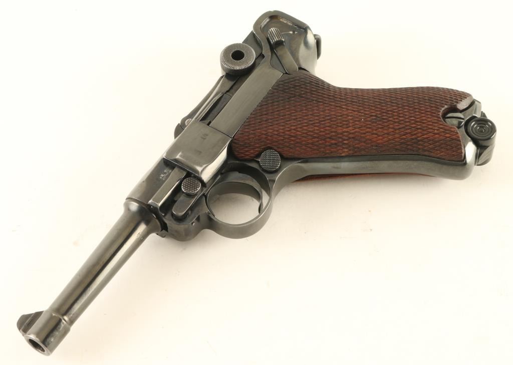 German semiautomatic pistol dated 1914, features blued finish (reblued), checkered wood grips, 4" barrel, fixed sights, manual safety, push button magazine release. Bore is good condition, fairly crisp rifling with visible small pits. Retains 90% reblue, with visible dishing and other signs of heavy buffing, bare metal visible on side plate ridge. Grips are good condition, appear to have had their front edge dovetails broken off from improper removal. All observed numbers match. No importer marks observed. Includes one aftermarket magazine. Condition is NRA Very Good as reblued *** C&R Firearm ***