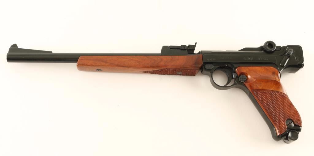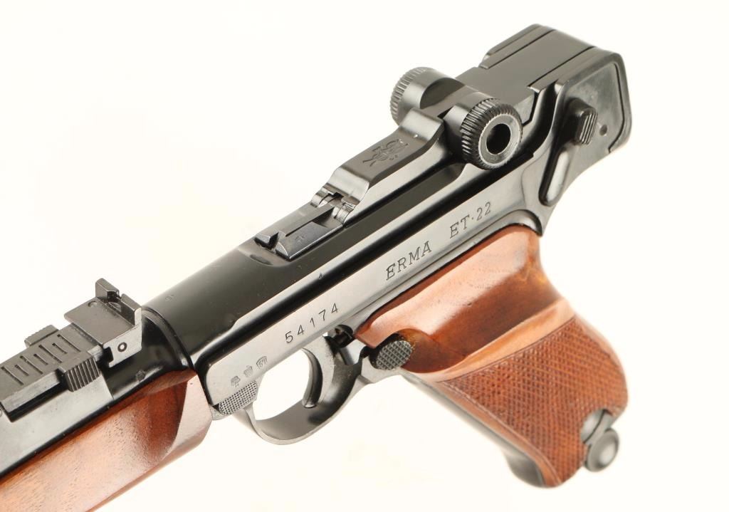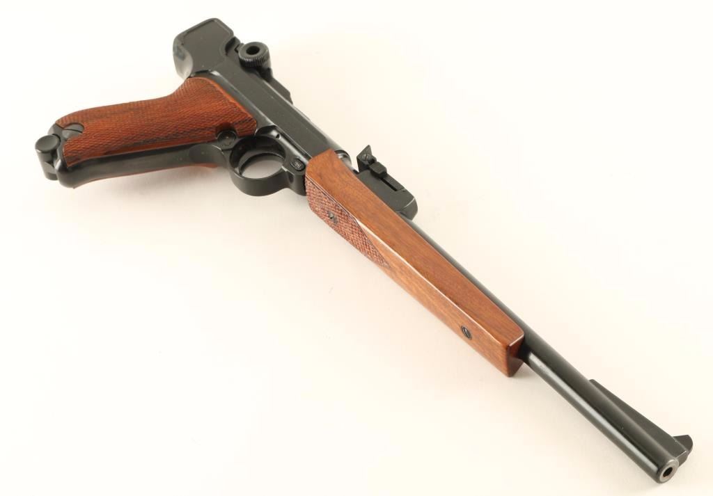 'Navy Luger' Seldom encountered German made Luger-stylized semi-automatic pistol chambered in .22 Long Rifle, circa 1967. Features a black finish, 11.75" barrel, ramped blade front sight, tangent rear sight, smooth crescent trigger, manual safety, push button magazine release, 10 round magazine, checkered walnut forend and two-piece checkered walnut target grips. Includes the original factory cardboard box with manual & target. Pistol exhibits approximately 93% of it's original black finish showing minor muzzle wear, some splotchy areas on the barrel & frame, and light handling marks/scratches. Action is smooth, bore is pristine and wood stocks are fine. Condition is very good+++ in box. ***C&R Firearm*** ***Modern Firearm***