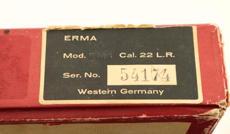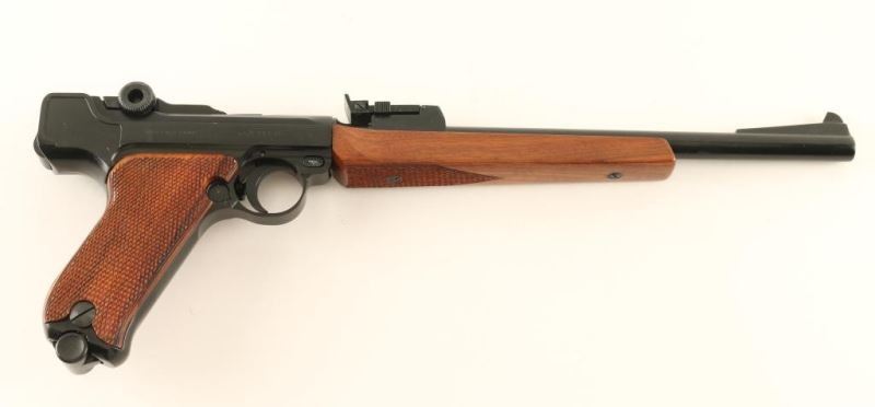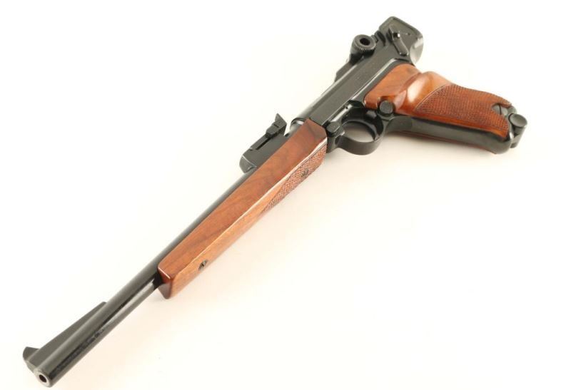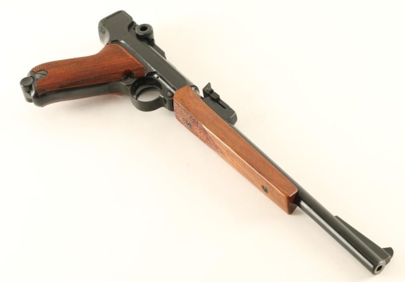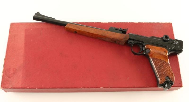 'Navy Luger' Seldom encountered German made Luger-stylized semi-automatic pistol chambered in .22 Long Rifle, circa 1967. Features a black finish, 11.75" barrel, ramped blade front sight, tangent rear sight, smooth crescent trigger, manual safety, push button magazine release, 10 round magazine, checkered walnut forend and two-piece checkered walnut target grips. Includes the original factory cardboard box with manual & target. Pistol exhibits approximately 93% of it's original black finish showing minor muzzle wear, light handling marks/scratches and some splotchy areas on the barrel & frame. Action appears mechanically sound but is miss the firing pin, bore is pristine and wood stocks are fine. Condition is NRA good in box. ***C&R Firearm***