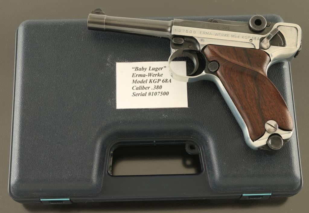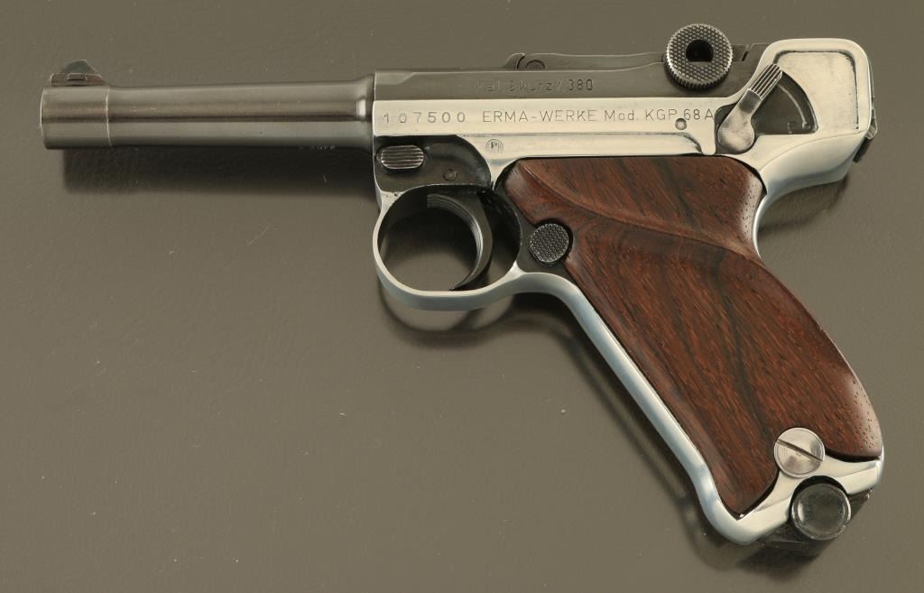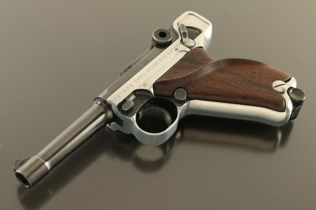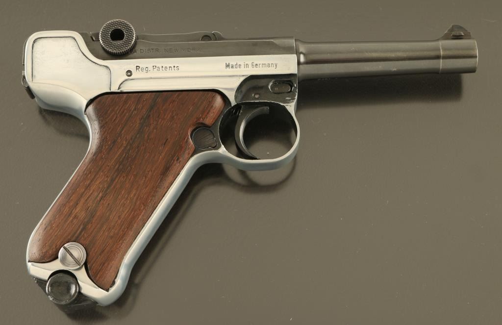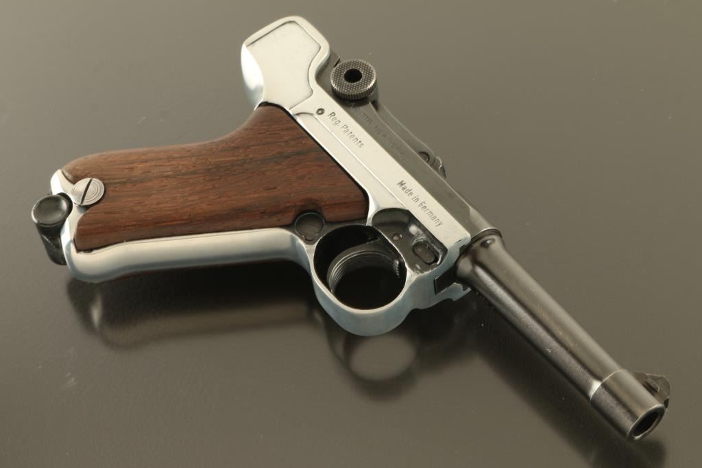German semiautomatic pistol patterned after the look and function of the original Luger Pistole Parabellum. Features two tone finish (blued with silver color bare metal receiver), wood thumb rest grips, manual safety, magazine safety, loaded chamber indicator, fixed sights, 3.5" barrel. Bore is excellent condition. Receiver appears to be stripped of factory finish, with some black paint remaining in protected areas. Blued parts retain 95% coverage. Grips are excellent. No import marks observed. Includes one magazine, and hard plastic carry case. Condition is NRA Very Good *** Modern Firearm ***