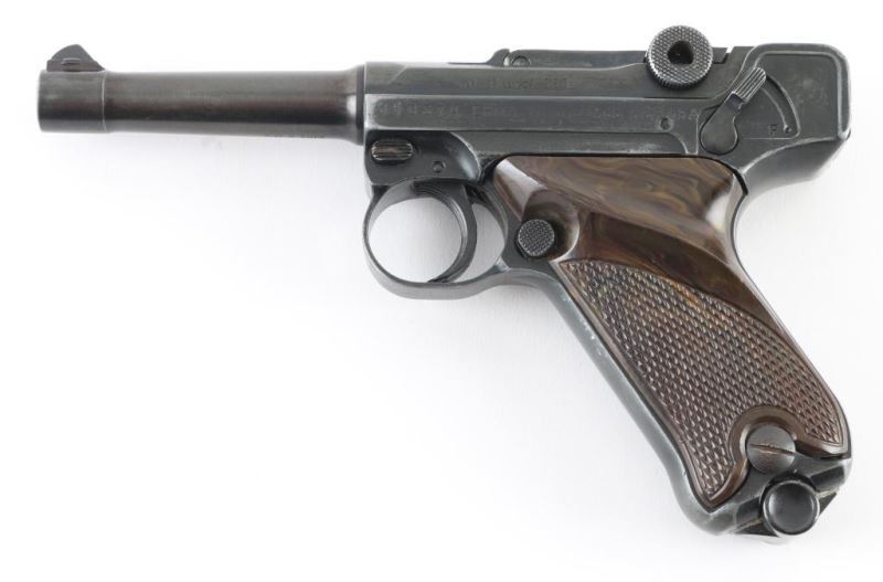 Pistol. Semi-Automatic. West German manufactured, and imported by LA Distributors, N.Y. (Right receiver) Imported in the 1980's. Vintage "Baby Luger" About 2/3the size of a P-08. Toggle locked. Short recoil action. 3.5" barrel. Bore appears excellent/bright. Serrated ramp/notch sights. Brown plastic checkered grips. Toggle action is a little stiff. Blued finish is about 80% with handling/edge wear, and some minor scratches. NRA Condition-Good. Modern Firearm.