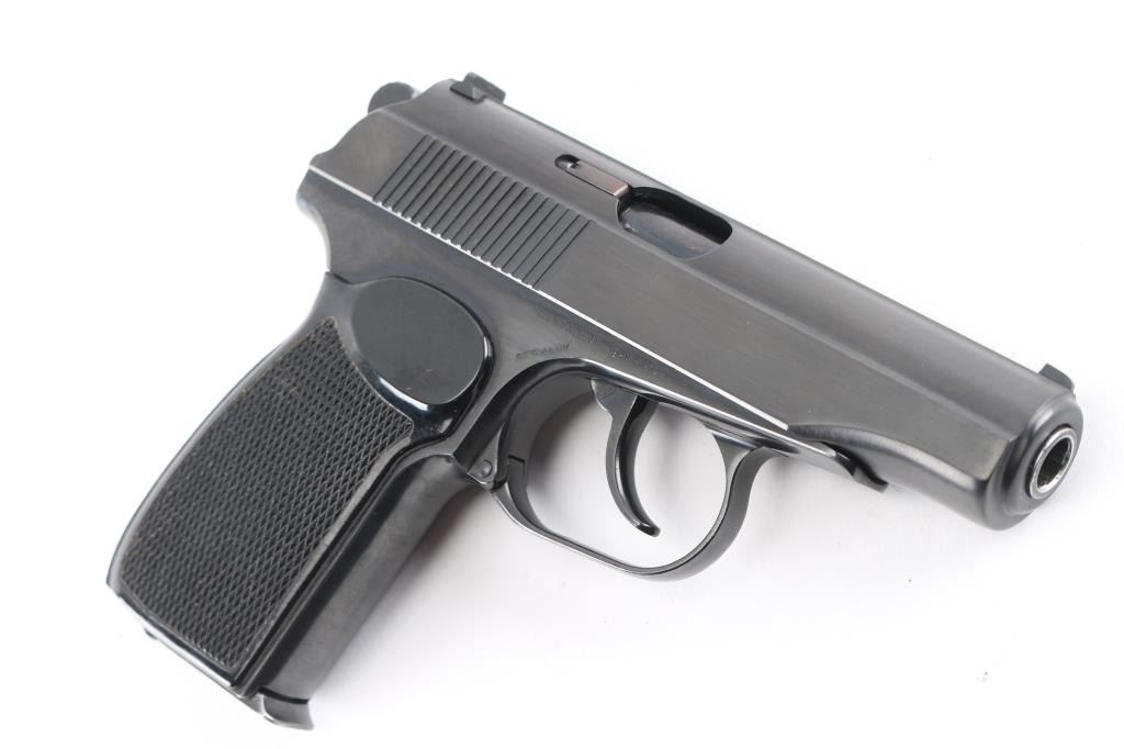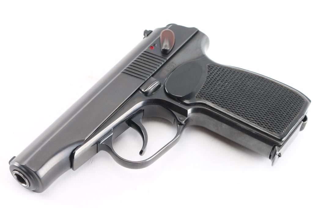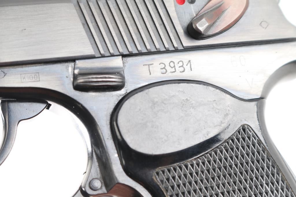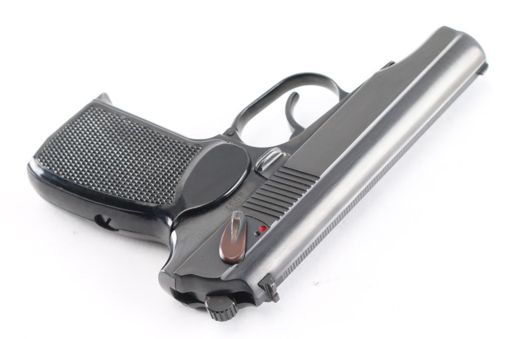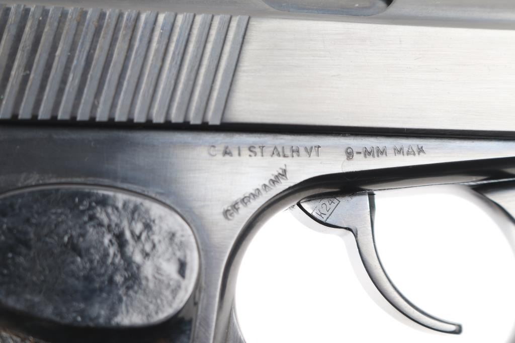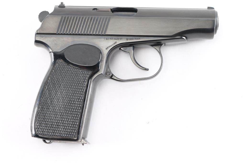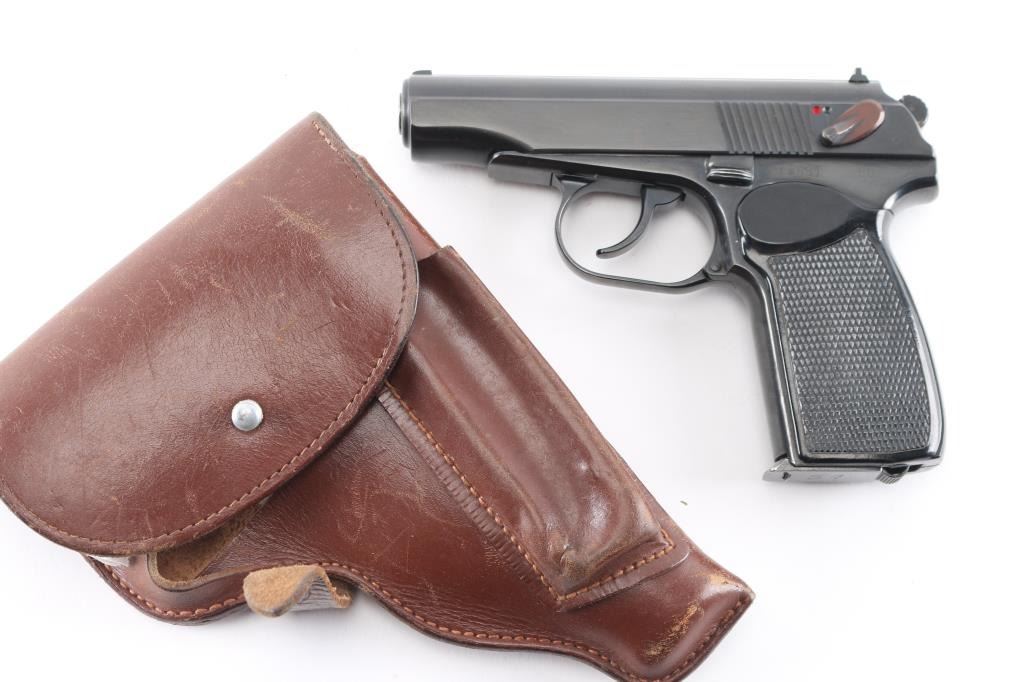 Cold war era East German military semiautomatic pistol, copy of Russian Makarov, imported by CAI, St Albans VT. Dated 1960. Manufactured 1958-65. Features blued finish, Plum colored safety lever, one piece wrap-around checkered black plastic grip, double action trigger, fixed low profile sights, slide mounted decocking safety, heel magazine catch. Bore is excellent/bright. Retains 98% finish with minor edge losses/scratches. Grip is very good. Includes dark brown leather flap military/police holster, cleaning rod, one magazine with "51" electropenciled on the floorplate. "Germany" stamped on the right frame.Condition is NRA Very Good+. C&R Firearm.