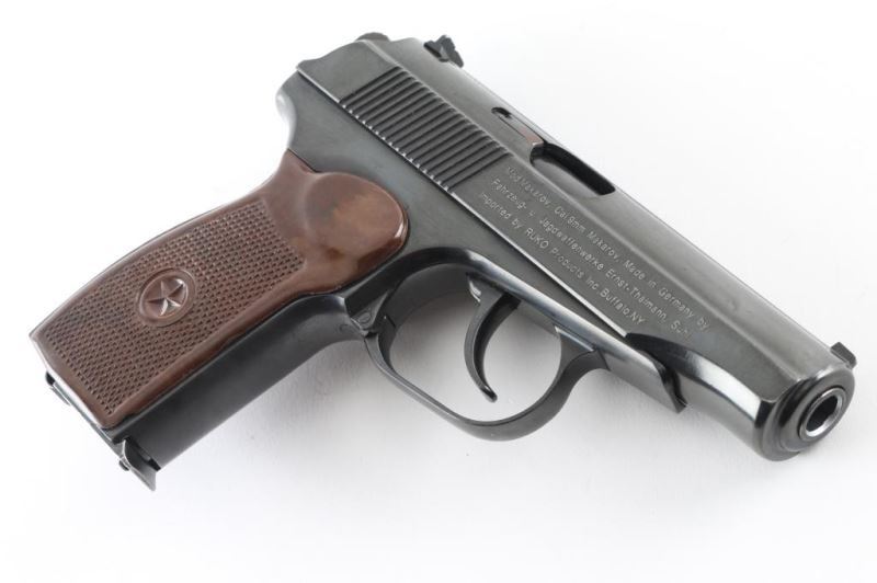 Pistol. Semi-Automatic. 8+1 Capacity. "Makarov" East German Made. Standard Military/Police sidearm of the Soviet Union & other Warsaw Pact countries. Blowback action. 3.75" barrel. Front blade and notch rear sights. Serrated topstrap. Slide mounted thumb safety, Imported by Ruko(Right slide) Blued metal finish. One-piece checkered brown plastic grips with Soviet star, right handed thumb rest. Lanyard loop. Bore appears excellent/bright. Blue finish is about 95% with some minor edge wear/scratches. Slide action is smooth/tight. Grips are very good. Comes with one 8-rd magazine and nylon carrying case. NRA Condition-Very Good++ Modern Firearm.