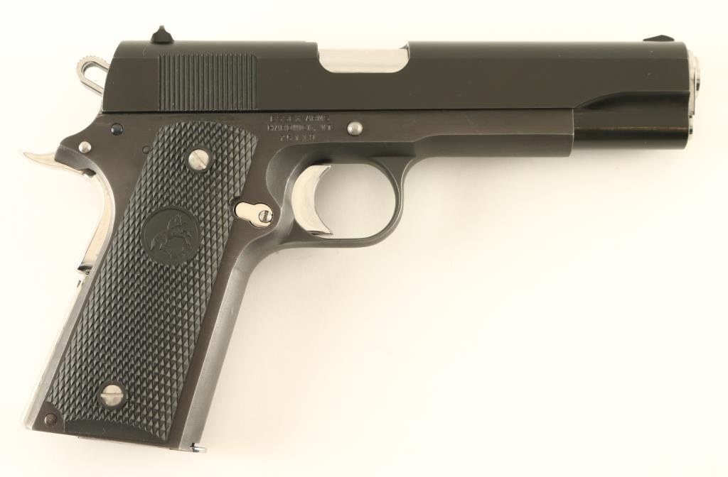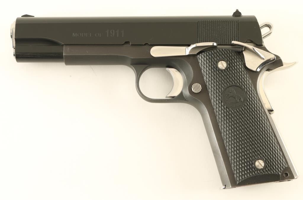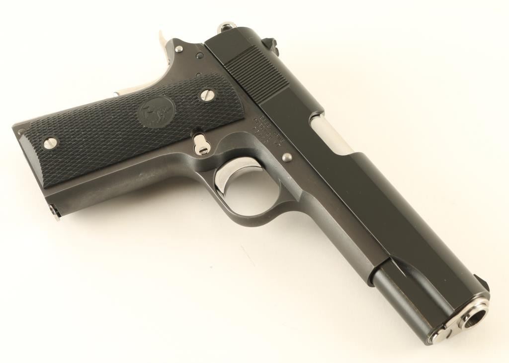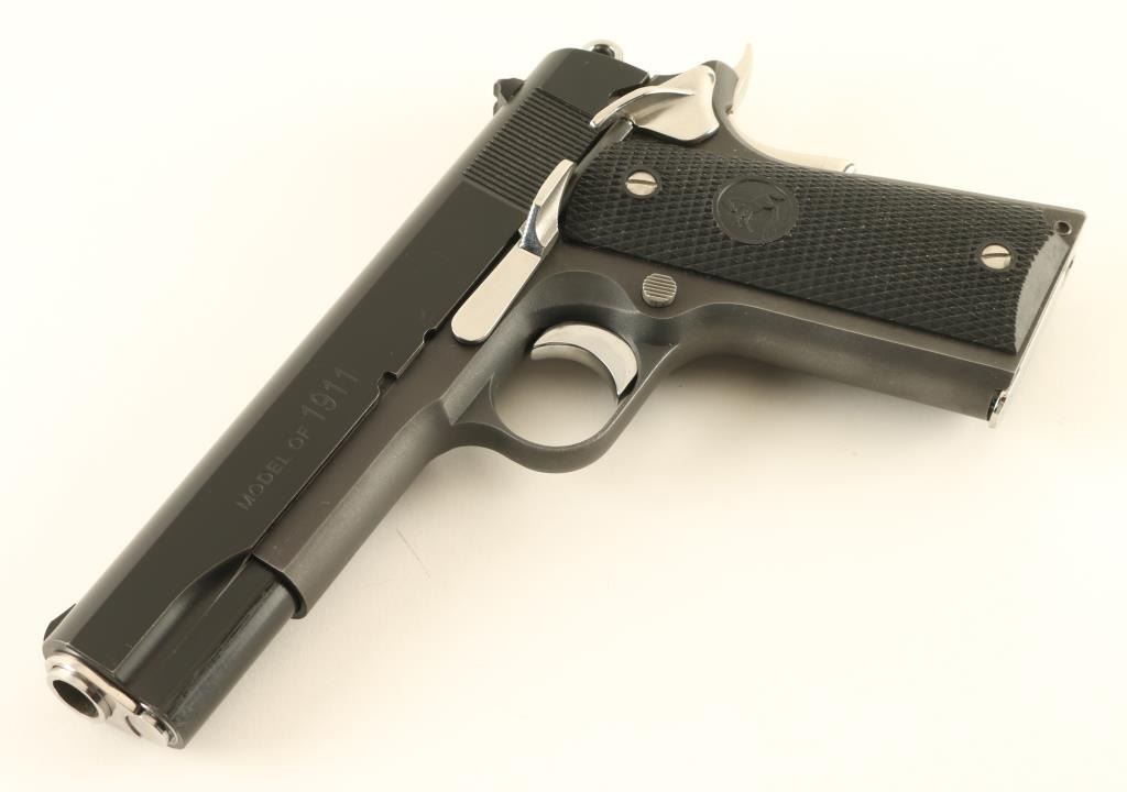 Semiautomatic pistol features polished blued slide, matte blue frame, other parts bright polished stainless steel, 5" barrel, fixed sights, extended slide release, extended thumb safety, narrow beavertail grip safety, checkered black polymer grips with Rampant Colt embossed logo. Bore is excellent. Overall condition is excellent with few signs of handling, rub mark on slide from slide stop installation. Includes one Colt marked magazine. Condition is NRA Excellent *** Modern Firearm ***