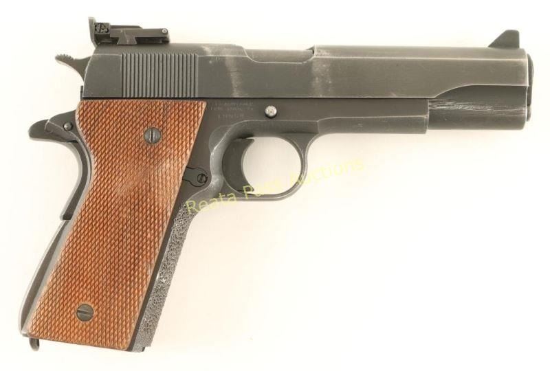 Put-together semi automatic pistol chambered in .45 Auto. Consisting of an Ithaca Gun Co. Inc. "P" marked slide, 5" "HS" marked barrel, and an Essex frame. Features a parkerized refinish, large blade front sight, Kensight adjustable rear window sight, smooth trigger, serrated hammer spur. thumb safety, beavertail grip safety, push button magazine release, no magazine, serrated mainspring housing with lanyard ring, stippled front strap and custom two-piece checkered wood grips. Pistol exhibits approximately 80% of it's parkerized refinish showing handling marks, moderate edge wear, and heavy finish loss around the ejection port. Action is smooth, bore is bright with good rifling and wood grips are very good. Condition is good. ***Modern Firearm***