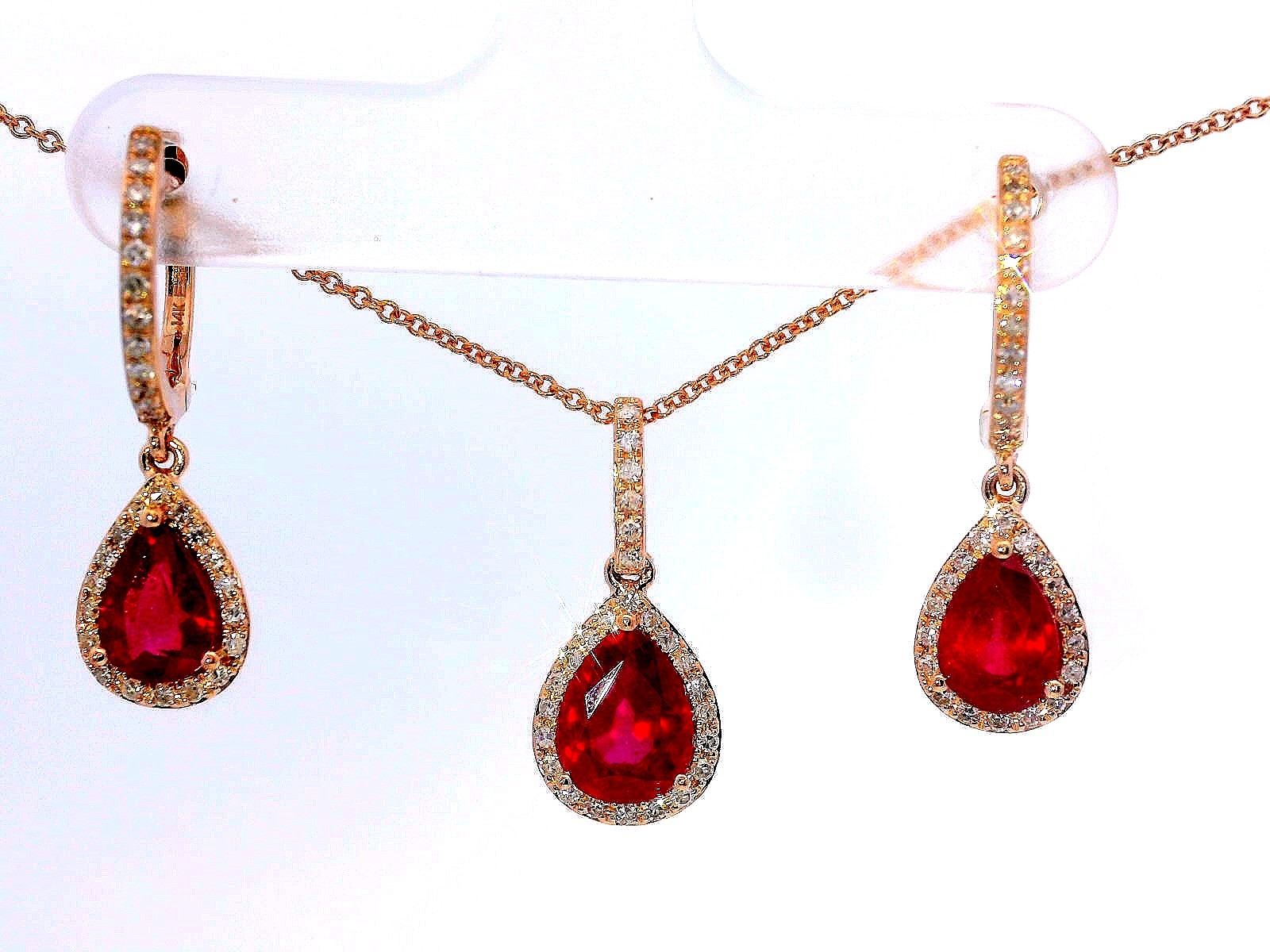 Donation: Estate 14K Rose Gold Dangle Pendant and Huggie Dangle Earring Set by Effy with Pear Natural Rubies and 86 .35 ctw diamonds with and 18” Rolo Chain