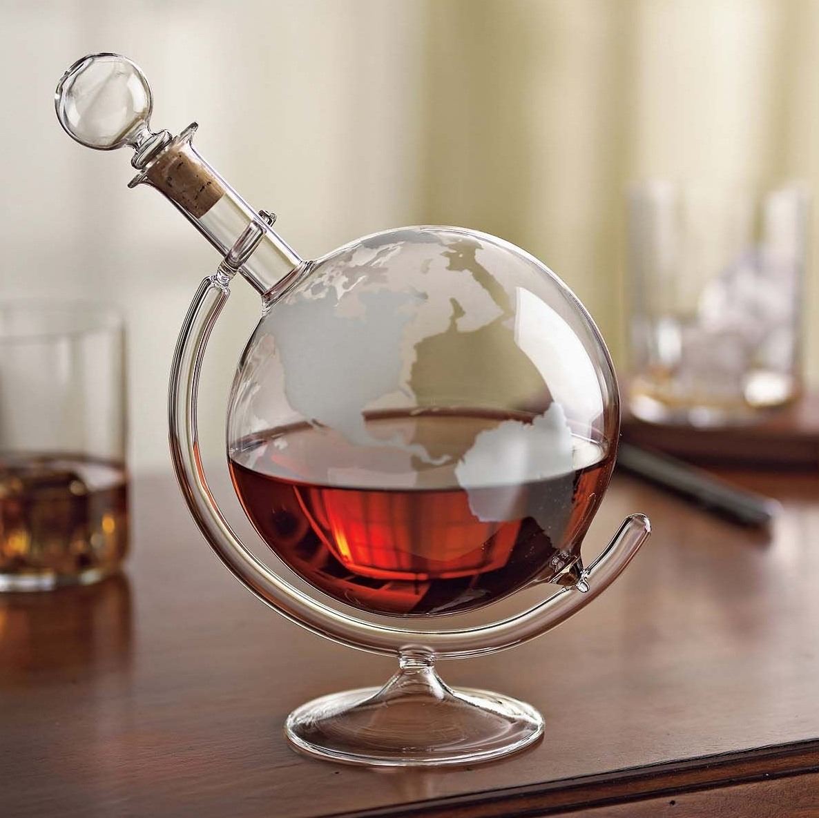 Etched Globe Whiskey Decanter and 2 matching glasses. WHISKEY NOT INCLUDED (YOU WISH!)