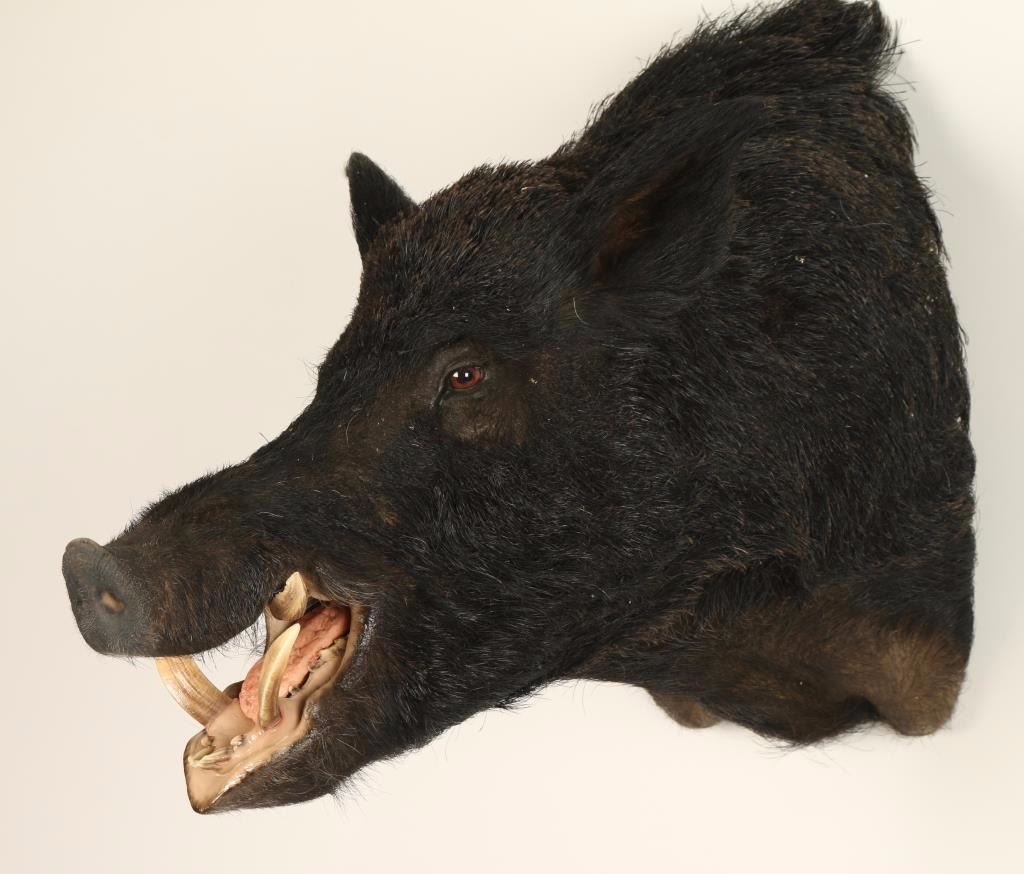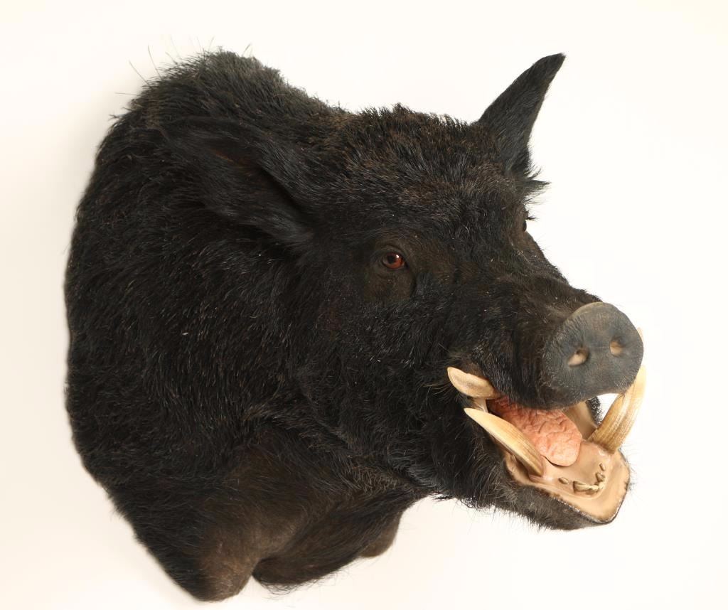 Shoulder mount with all black fur and 4 tusks. Overall good condition. Measures 31" from shoulder to snout and 24" from neck to back.. Largest tusks are 3" long.