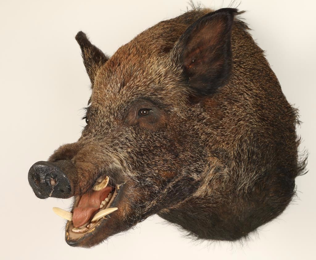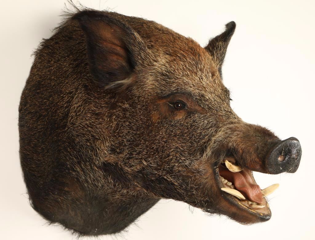 Tan with black tipped fur and 4 tusks, has small crack in snout and some losses around lips, otherwise good. Mount is 28" from back to snout and 24" from top to bottom.