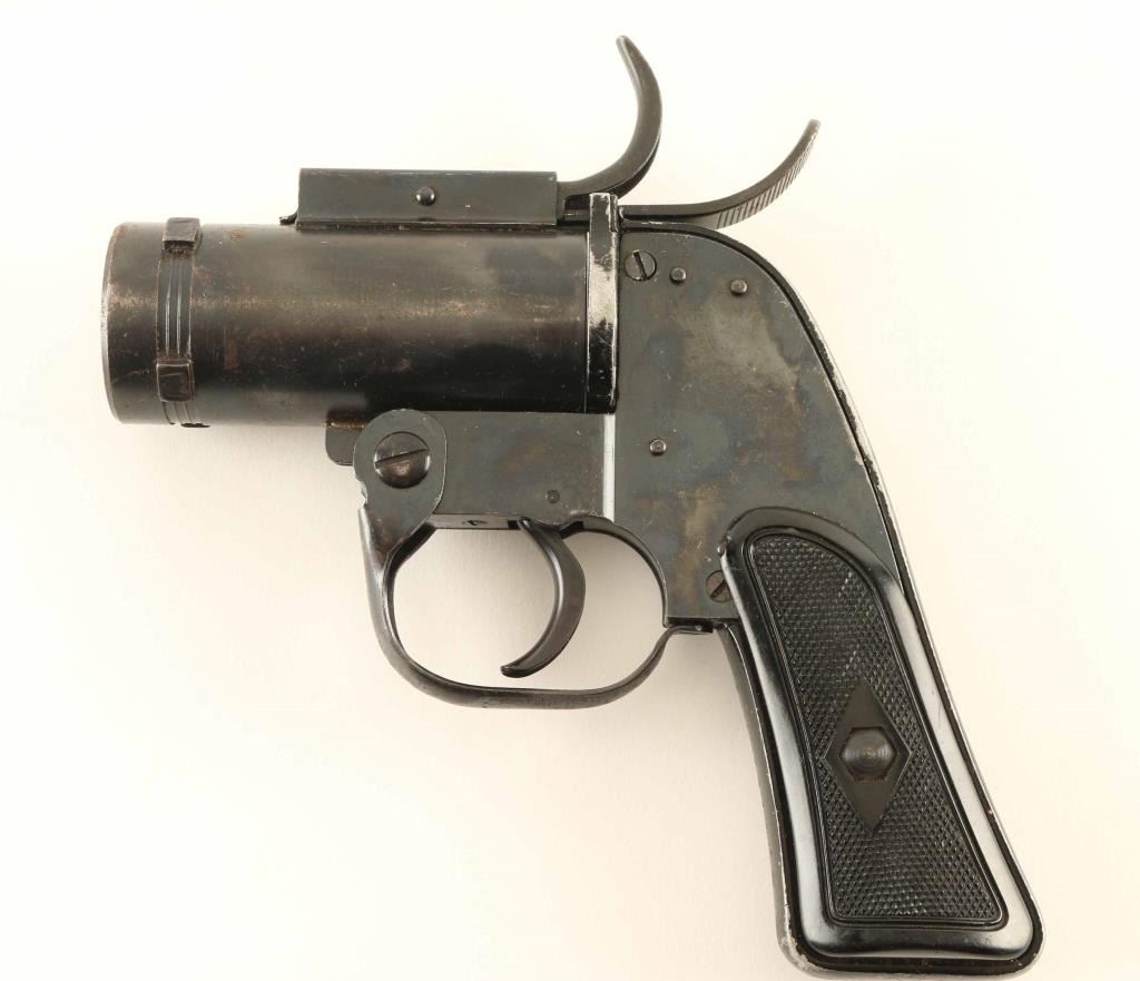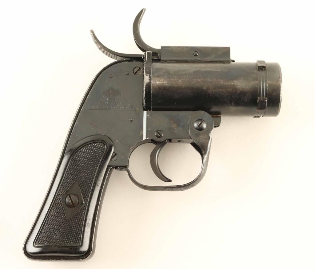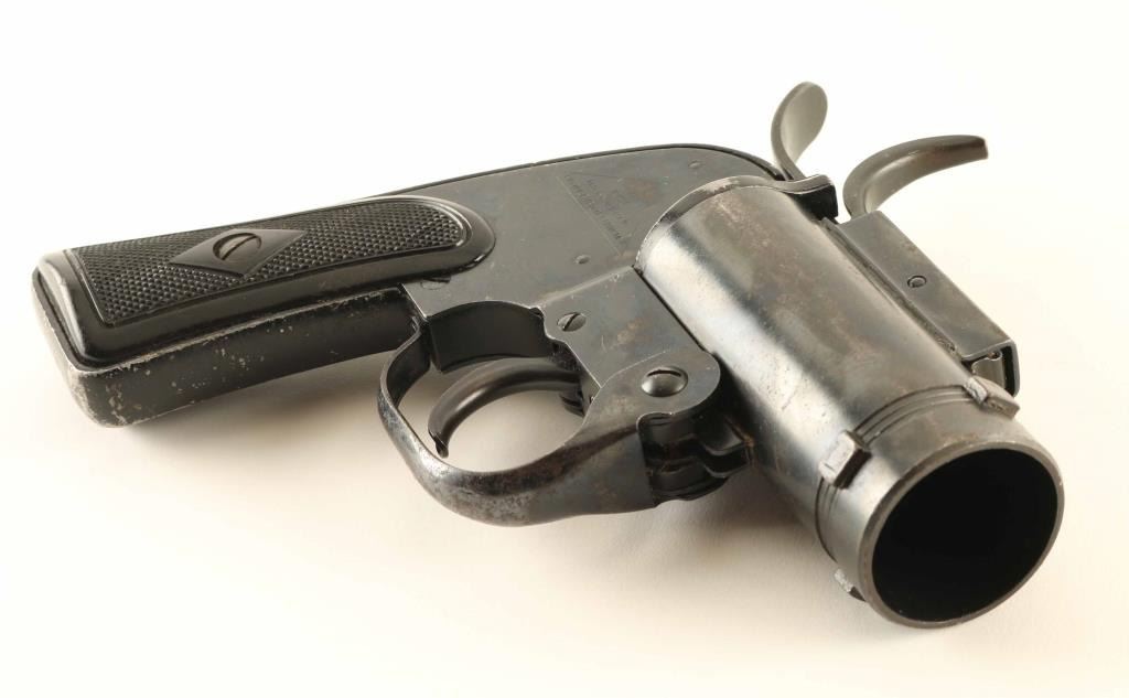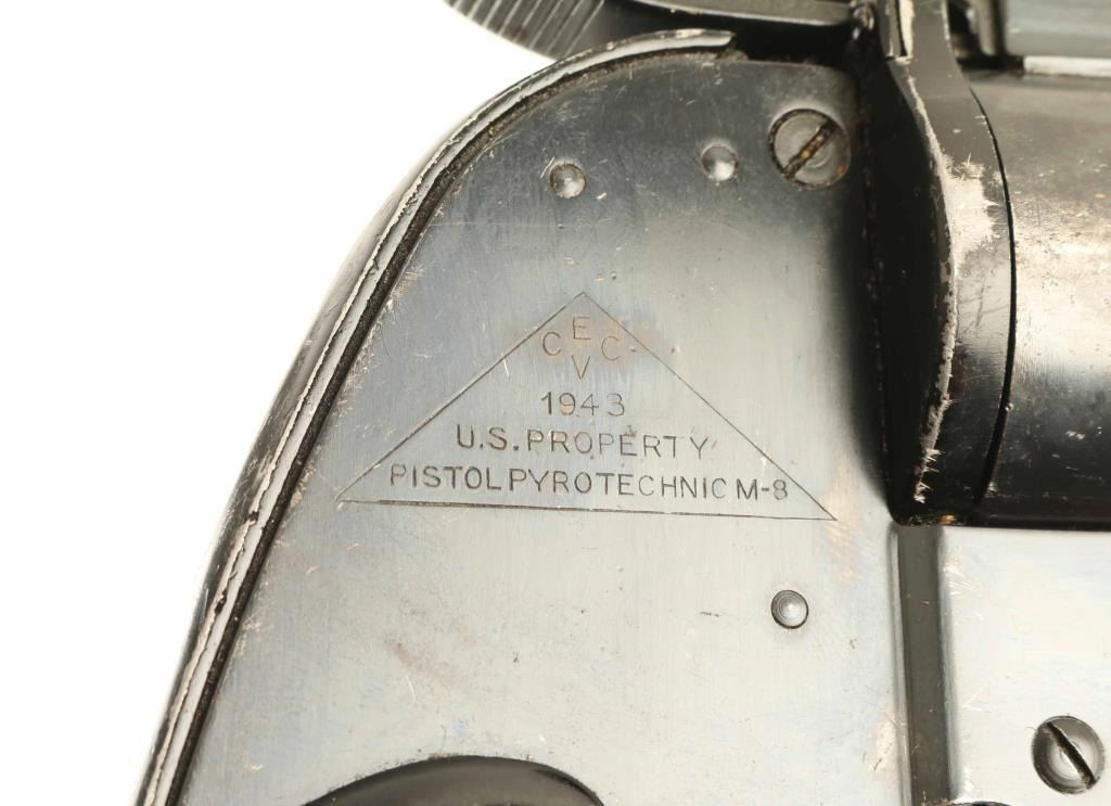 #E-142083 WWII and later era U.S. military double-action-only top-break 37mm flare pistol developed primarily for aircraft use. Features a 4 1/8" barrel, steel frame with aluminum grip straps, smooth trigger w/ guard, concealed hammer, checkered black synthetic grips. Two latches on top, one to open the action, one to release from an aircraft flare port mount. The right side of the frame is marked "EVCC / U.S. PROPERTY / PISTOL PYROTECHNIC M-8" in a large triangle and the butt is stamped "P" with crossed cannons mark. Bore is very good condition with little roughness. Steel parts retain 80% dark bluing with bare metal on high spots, scratches and small areas of patina forming in places. The black painted grip straps retain approximately 60% finish. Grips are excellent condition. Overall condition is Very Good.