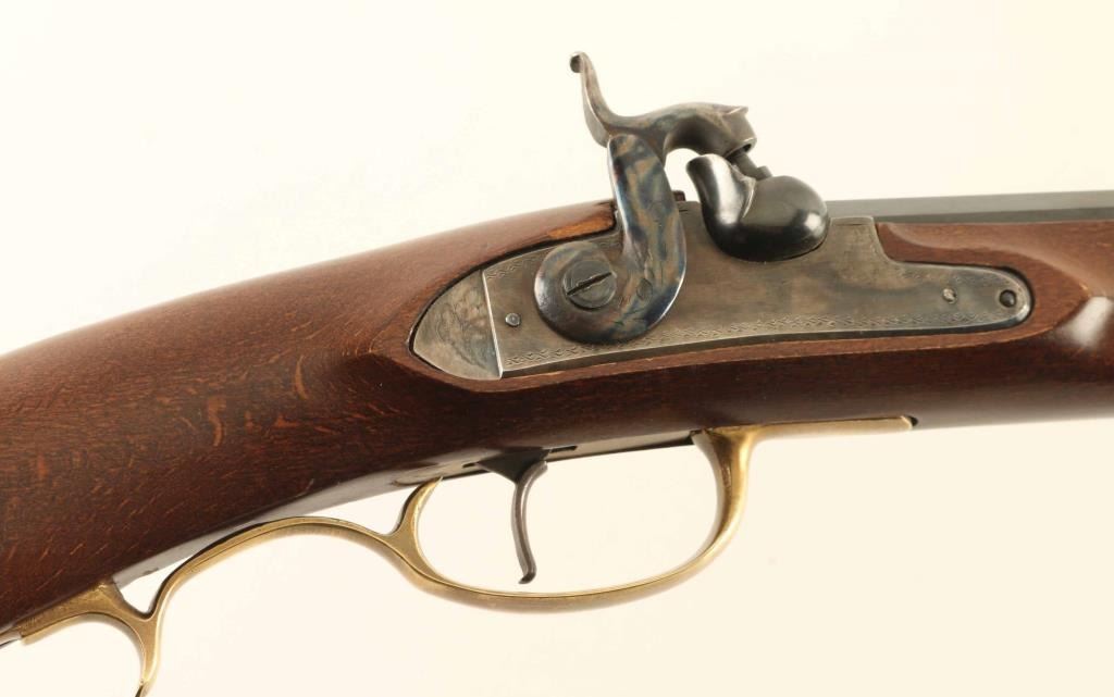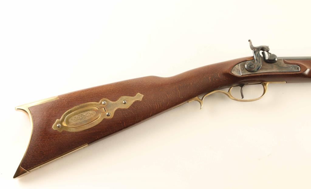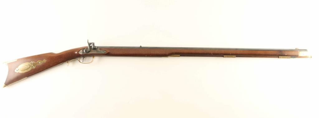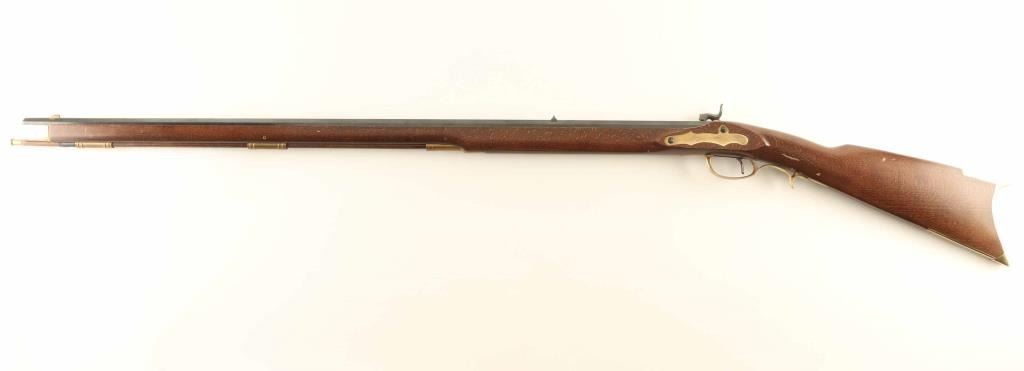 Italian replica single shot percussion lock rifle for use with black powder or Pyrodex only. Features blued barrel, case color lock, brass fittings, wood stock with full length forend, 35" octagon barrel, dovetail mounted sights, ramrod under barrel, patch box in butt, crescent buttplate. Bore is excellent. Overall condition appears good, never fired, with handling marks, scratches, dents to stock and some light scattered surface rust on the barrel.