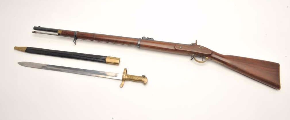 Euroarms replica of an Enfield percussion rifle, .58 caliber blackpowder only, 32.5” barrel, blued finish, wood stock, S/N 9874, with replica bayonet and scabbard, overall good to very good condition with dime sizeloss of finish to right side of barrel near muzzle. Est.: $150-$300.
