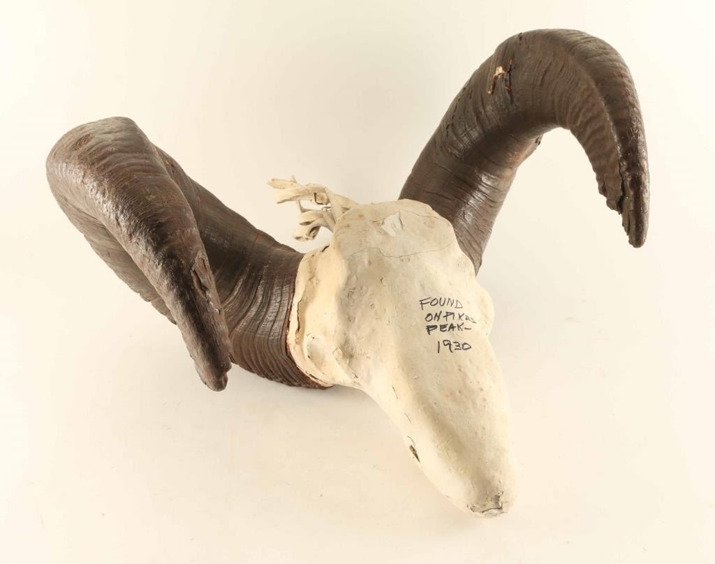 Skull and horns marked found on Pikes Peak 1930, measures horns 30" and 22"wide.