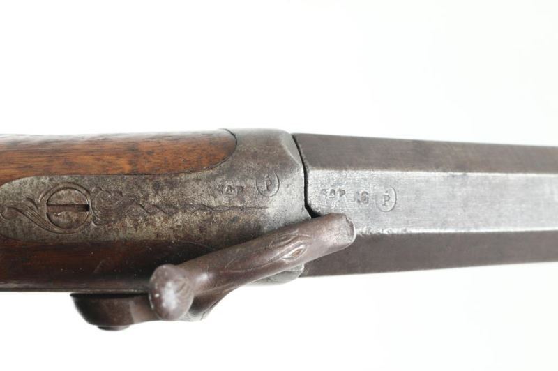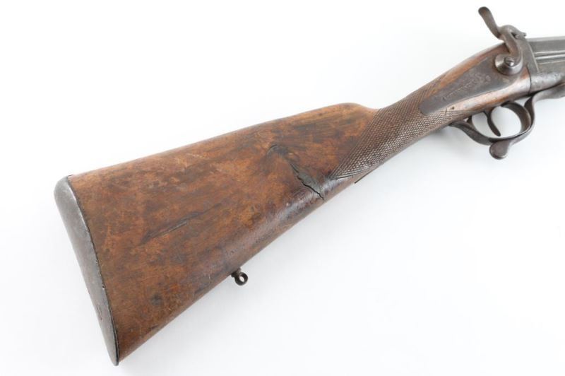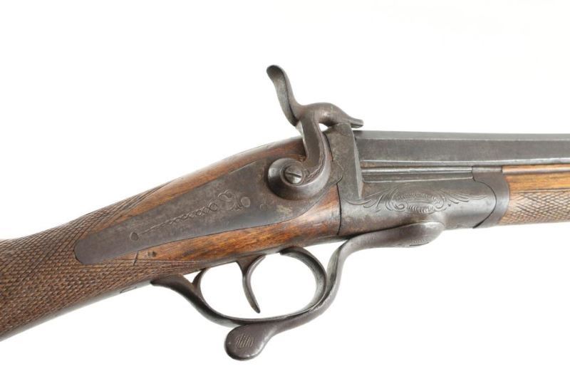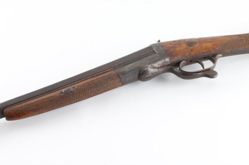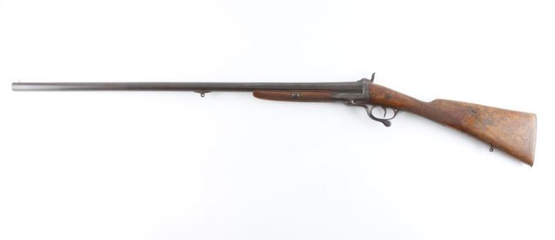 Features single 30" plain barrel, CYL bore, brass front bead, side swing under lever opening, back lock action, sling eyelets, smooth metal buttplate, slender wood forend, shallow checkering at forend and wrist. Bore is good condition, fairly bright with some light patina scattered throughout. Metal shows a brown color, mostly smooth with some thicker patina, several scrapes showing bare metal. Wood is good overall with some finish loss, many small dings and scrapes, crack through middle of butt. Action is functional. Condition is NRA Very Good *** Antique Firearm ***