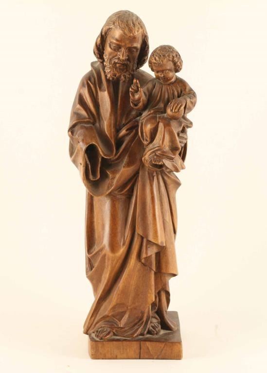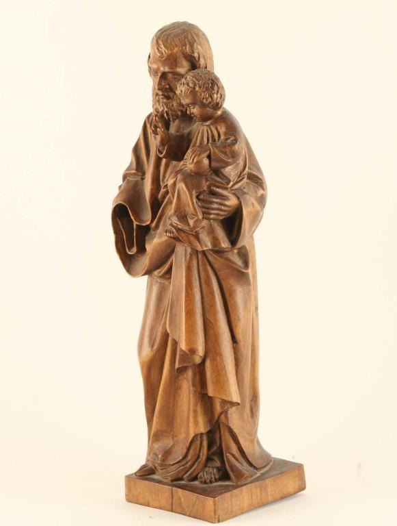 Hand carved statue of St. Joseph and child and approximately 8" in height. Missing right hand.